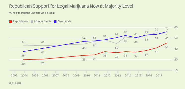 In 2011, 50 percent of Gallup survey respondents supported legalization, and in 2001, that number was just 34 percent. The issue is trending toward non-partisanship, as well, with a majority of Democrats (72 percent), Republicans (51 percent) and Independents (67 percent) supporting pot in the most recent poll.
