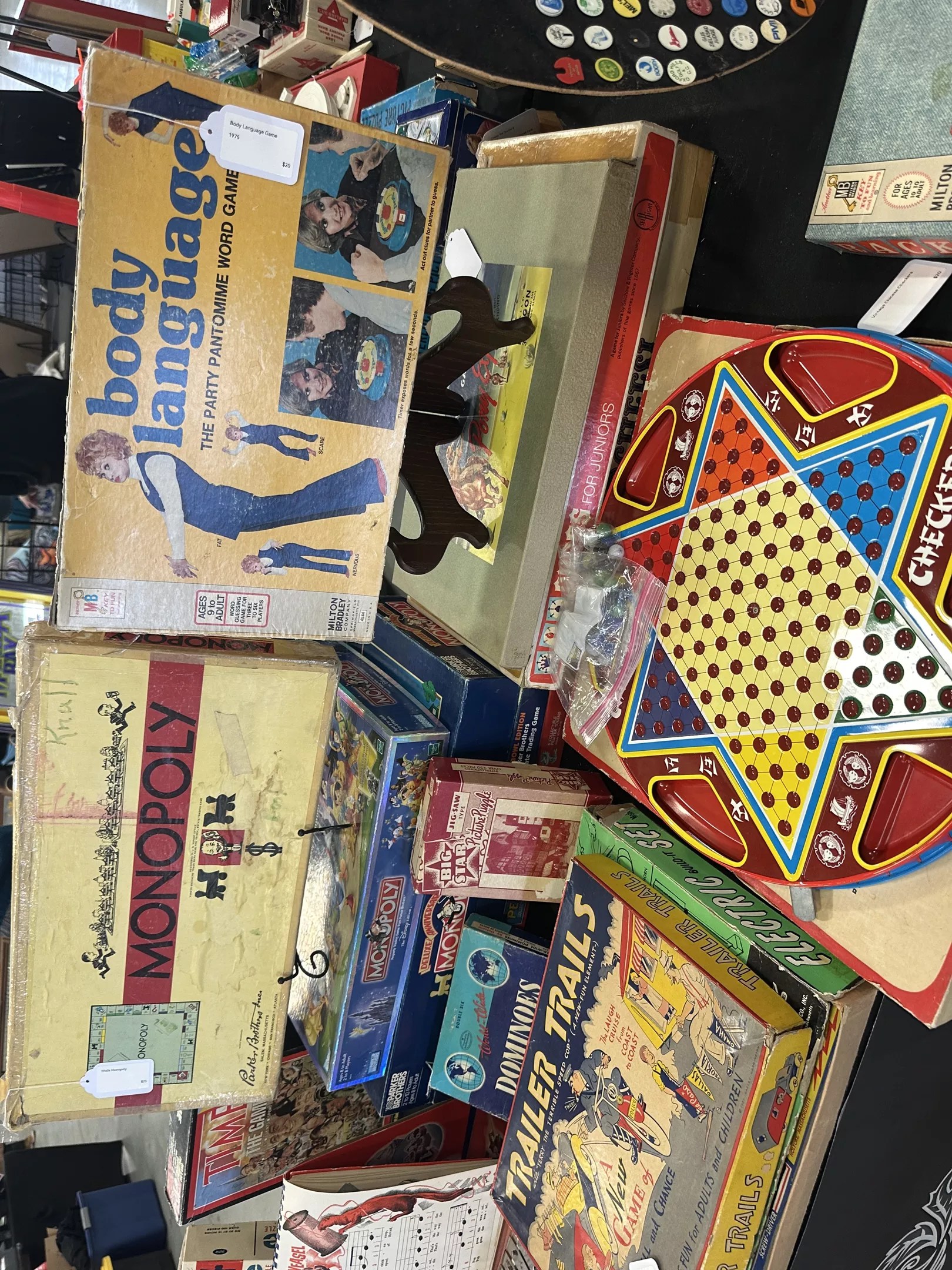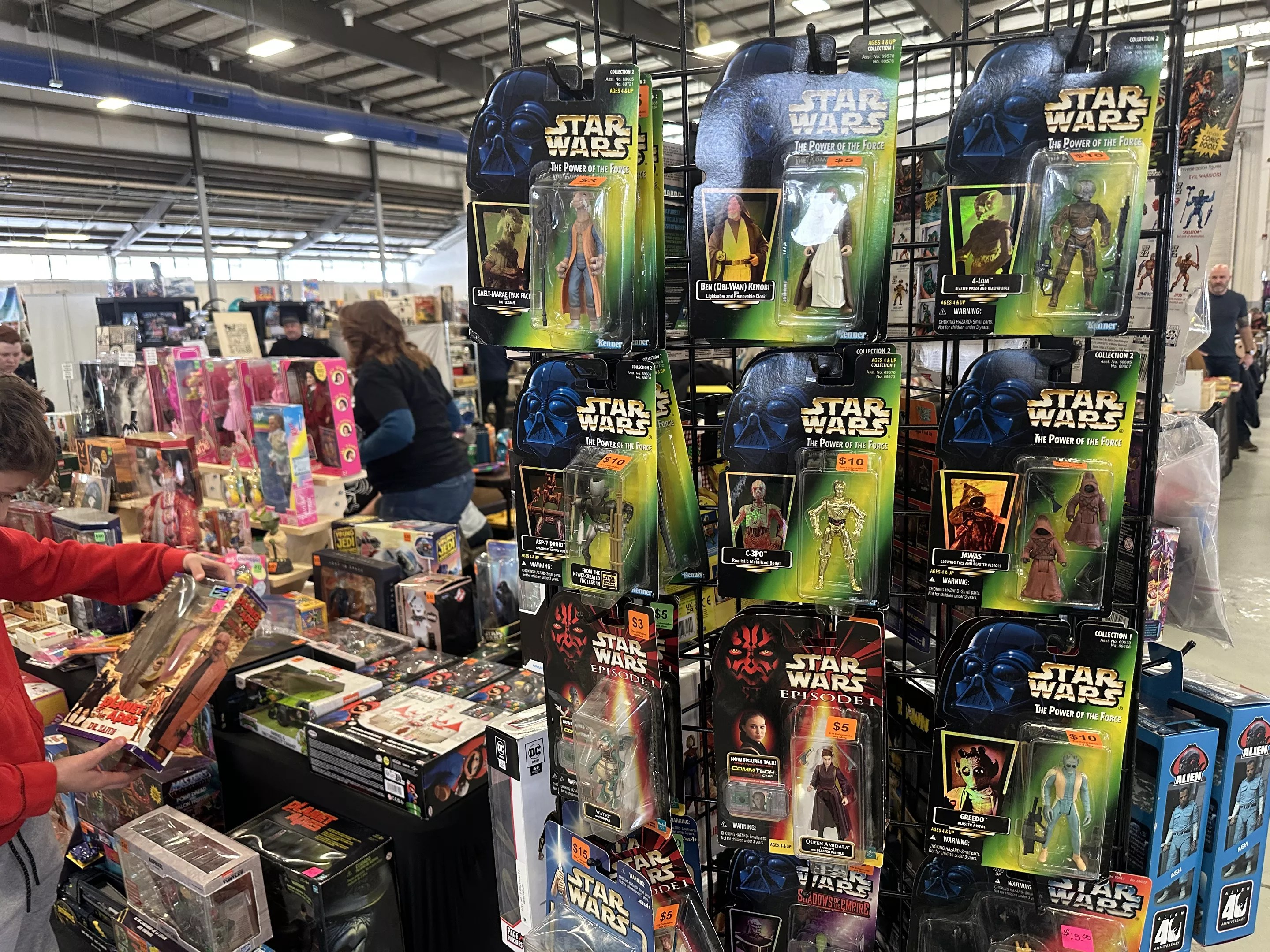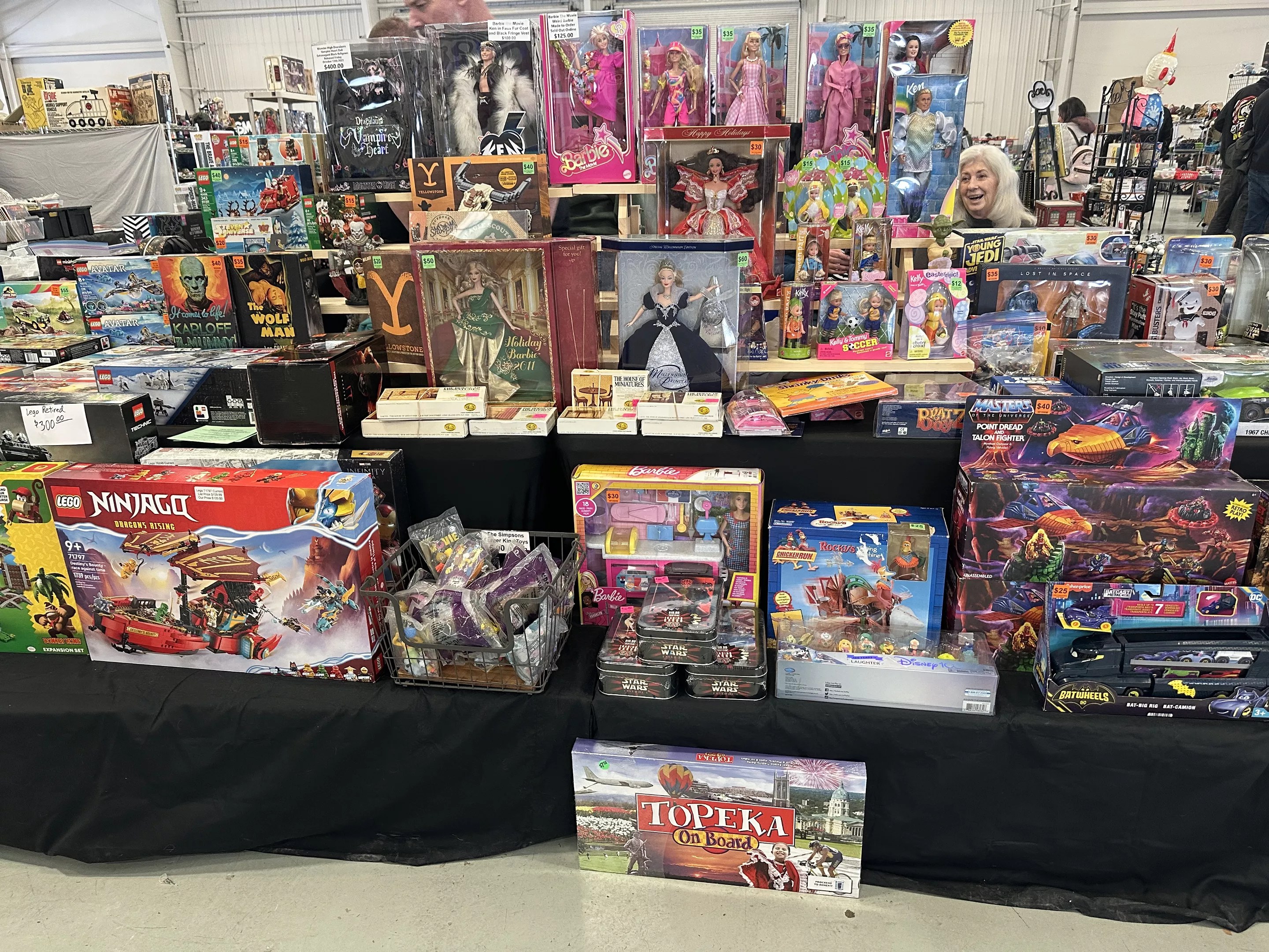 Here’s a photo of lots of great stuff: LEGO, He-Man, Barbie, old Universal Monsters, Star Wars,and more. And then there’s that box sort of featured (?) on the floor in front of it all: Topeka On Board, which is apparently a Monopoly clone based on, yes, the streets and sights of Topeka, Kansas. Why is it at a show in Longmont, Colorado? We suspect it’s like a koan: The question is the answer. Somehow.