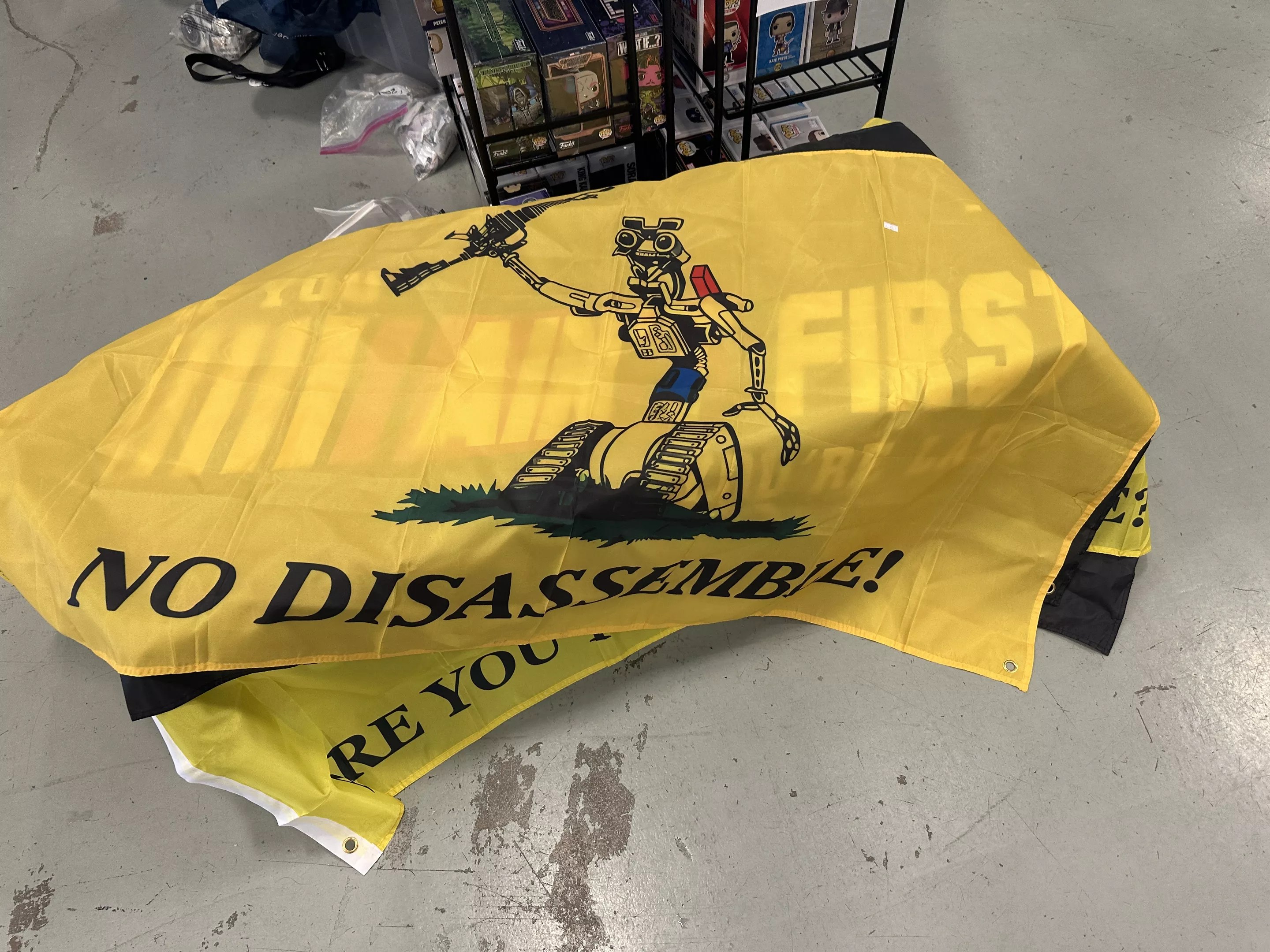 Are there enough kids of the ’80s left out there who remember Short Circuit’s Johnny 5 fondly enough to fly a flag featuring him protesting disassembly? Does anyone remember Fisher Steven’s cultural appropriative brown-face in the 1985 film, or the fact that Johnny 5 took his name from the classic El DeBarge song? At least Johnny 5 seems to be protesting gun violence on this flag. Or that’s how we’re choosing to take it, anyway.