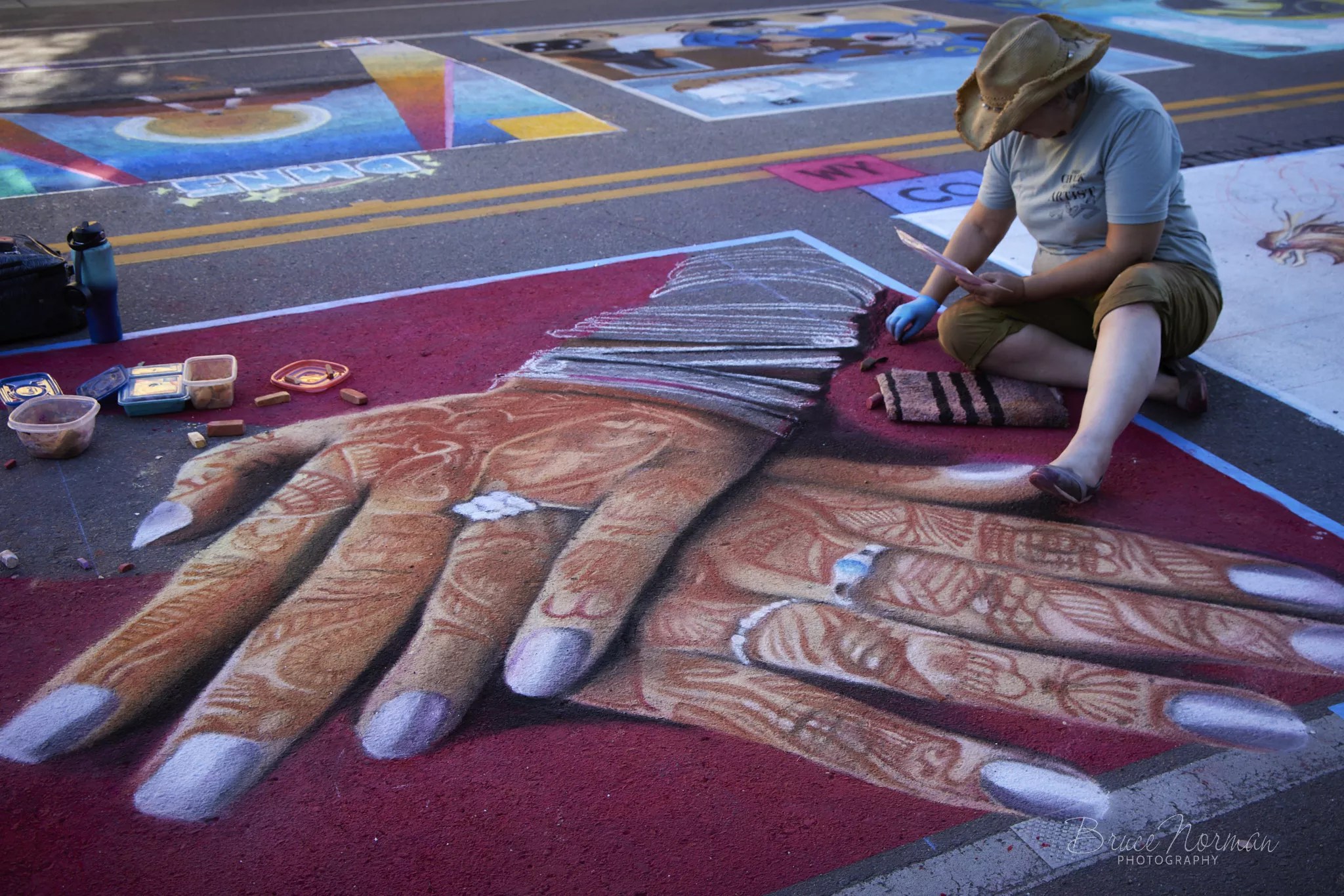 An artist works on their entry for the 2024 Denver Chalk Art Festival.