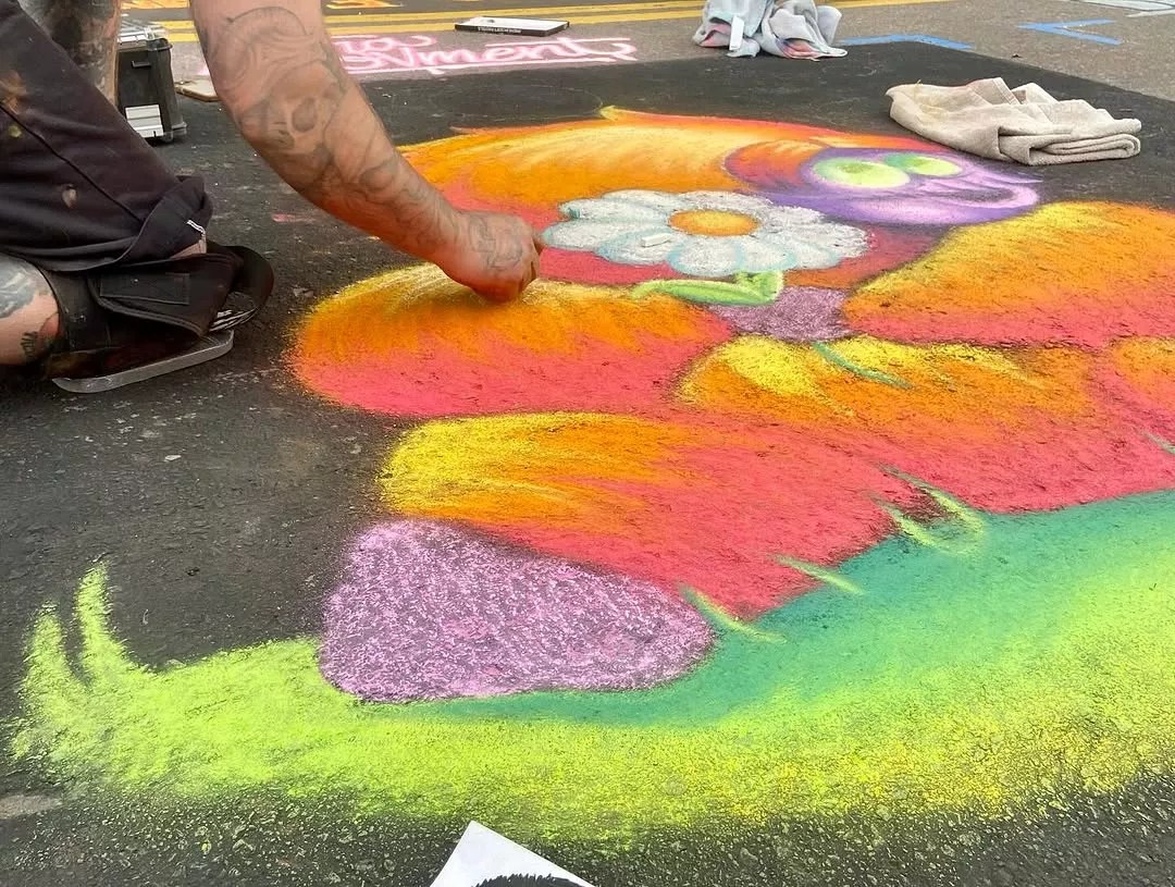 It starts with a sketch and a few sticks of chalk. Then come the artists — some professionals, some complete newcomers — kneeling side by side on the concrete. As hours pass, hands darken, colors bloom and an ordinary city block is transformed into a living gallery.