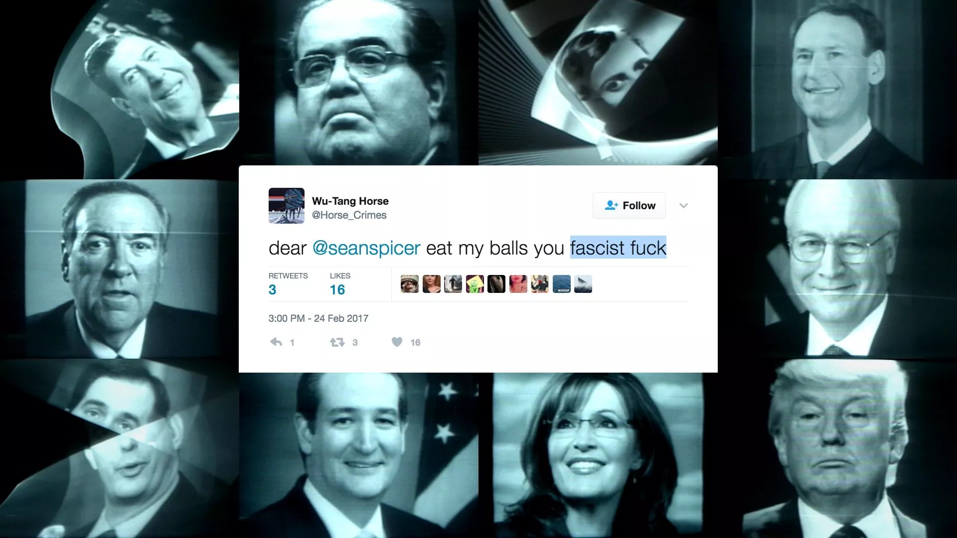 Next up: James Connolly’s “Aesthetic Catharsis” examines what happens when people find a way to channel their political rage into sloppy, cathartic phrases like “fascist fuck,” all while showing a grid of images of Republican presidents from Ronald Reagan to George W. Bush to Donald Trump. In the process, it raises the question: When is it okay to call a person in power a fascist, and when is that just a form of release?