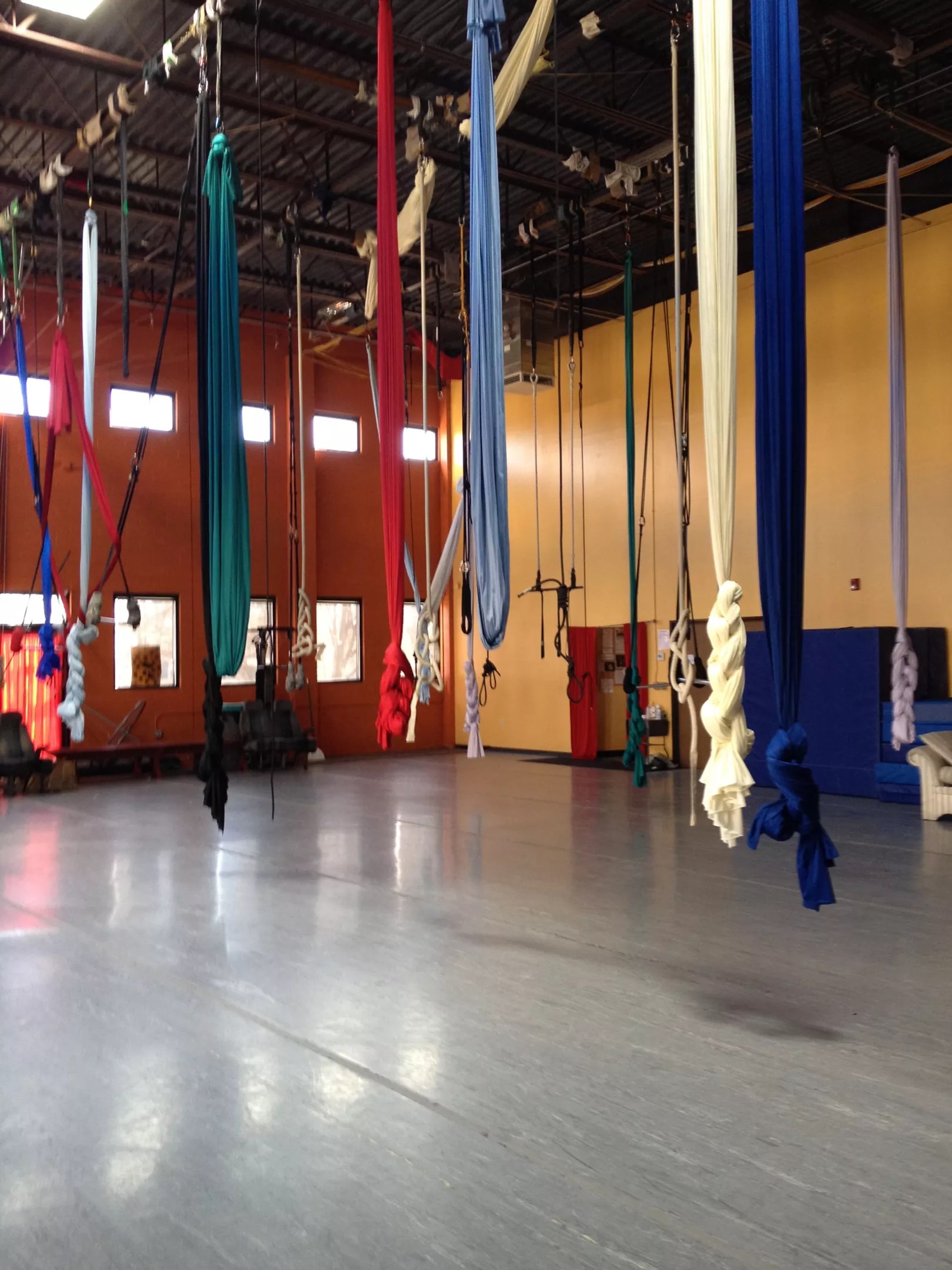 Aerial silks hang from sturdy rigs at one of the studios at Frequent Flyers Aerial Dance in south Boulder.