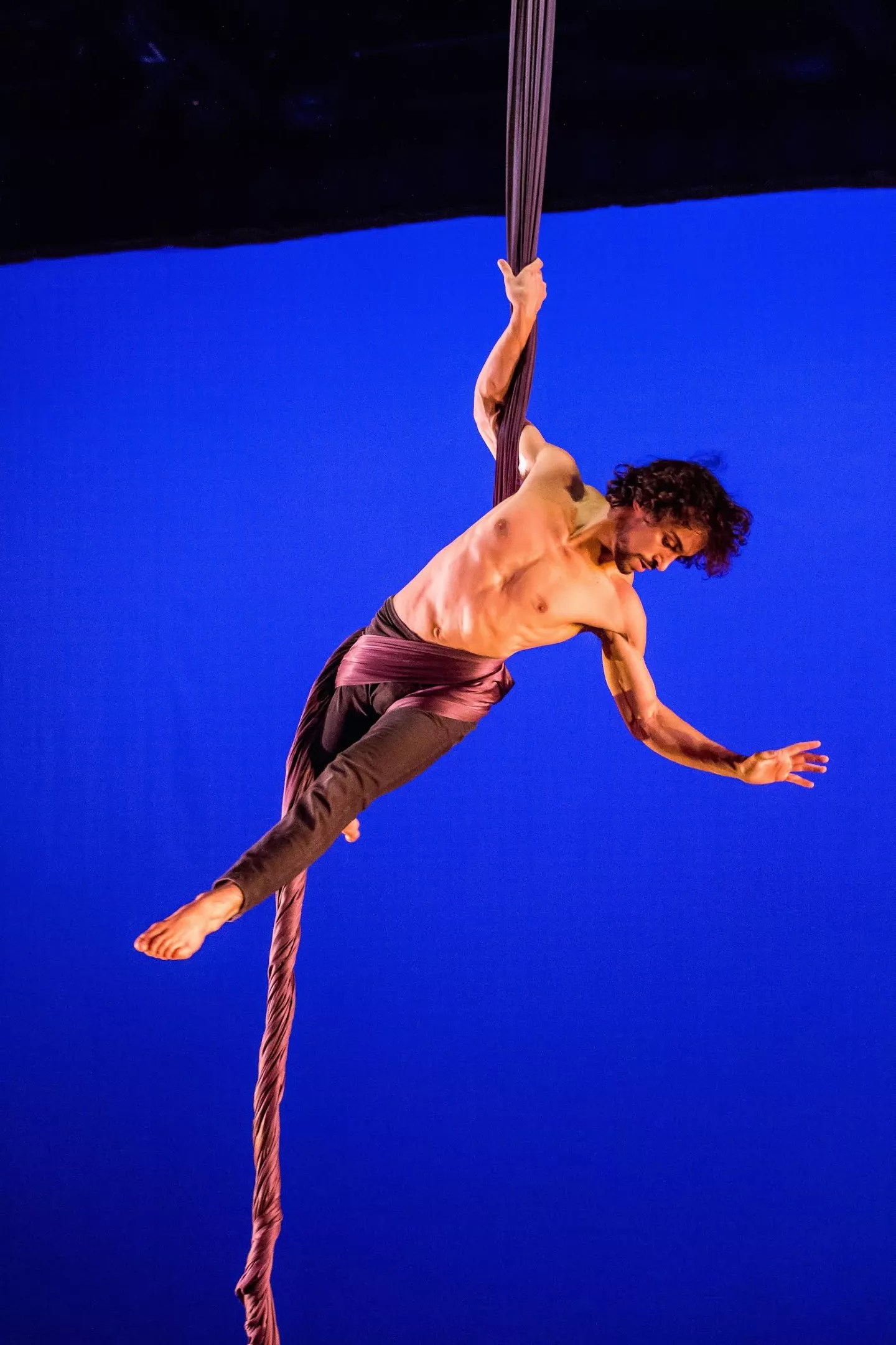 And aerial dance isn’t restricted to just the single-point dance trapeze. Most widespread are aerial silks, made of jewel-toned synthetic fabrics that dancers twist around their limbs or torsos, and lyra, in which dancers thread themselves through a hoop suspended from the ceiling. Other performers use a loop of aerial silk called a sling; the cyr wheel, a rolling hoop that spans nearly six feet in diameter; or a vertical rope known as a corde lisse that puts the vine-swinging antics of Tarzan to shame.