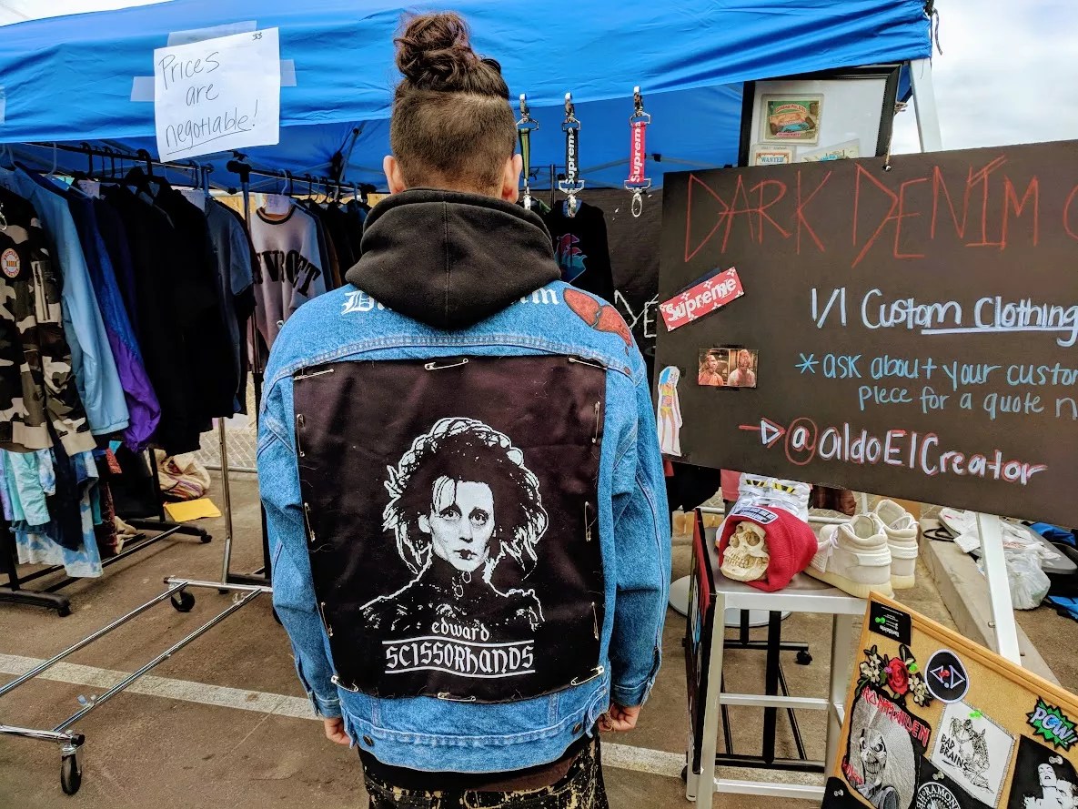 Olivarez wears a Dark Denim jacket with a back patch of his favorite film, Edward Scissorhands.