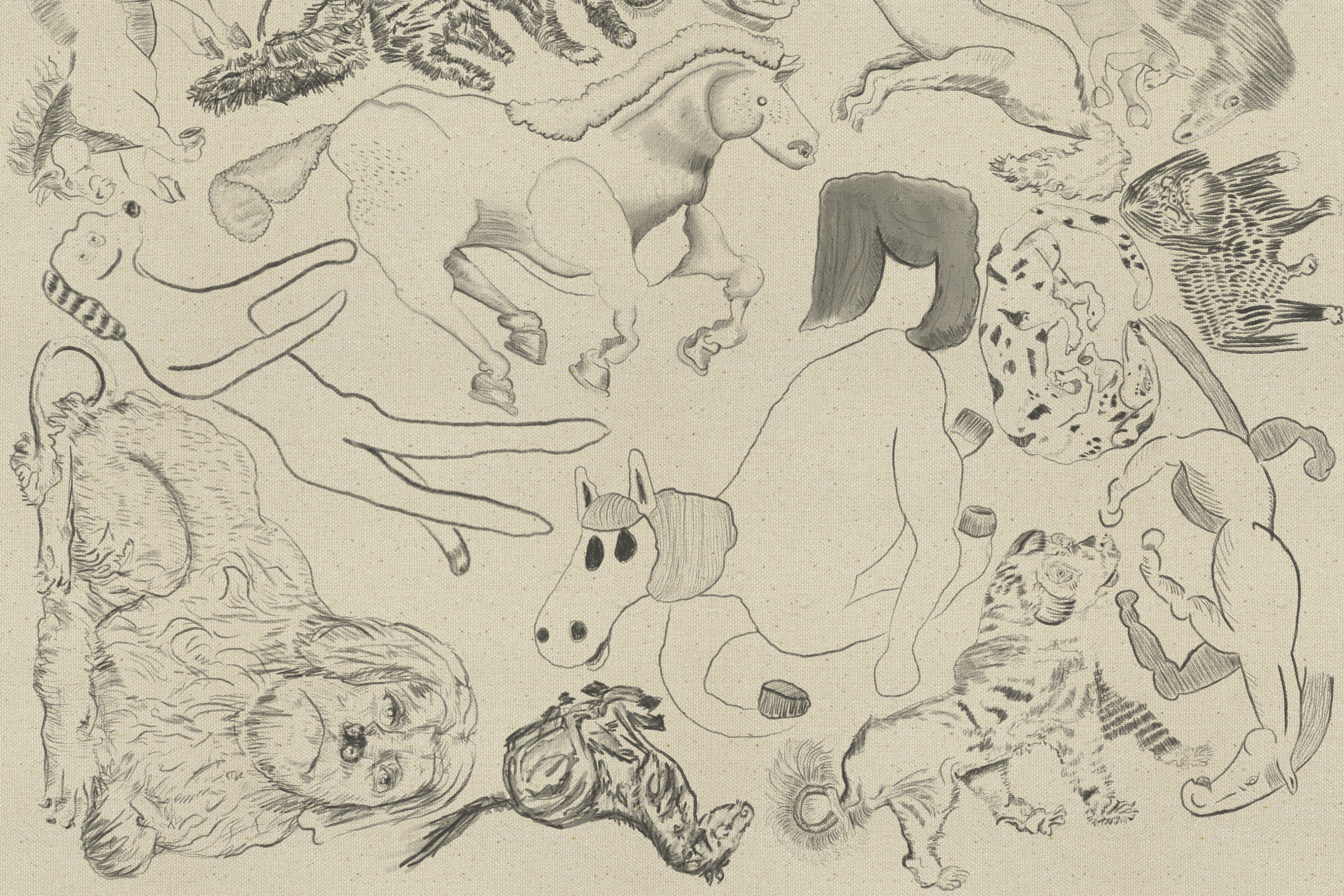 Paul Kenneth’s work, a mixture of drawings, paintings, prints and sculpture, all begins with an active hand that not only suggests movement but also throws creatures — in this case, multiple horses or dogs — that interlock like puzzle pieces, playfully overspilling with whimsy and humor on a background with no perspective. Kenneth’s high-octane doodling brings to mind a boy lying on his stomach on the floor to draw, with a head full of wild ideas — but his keen draftsmanship uplifts the work with a visual smile.