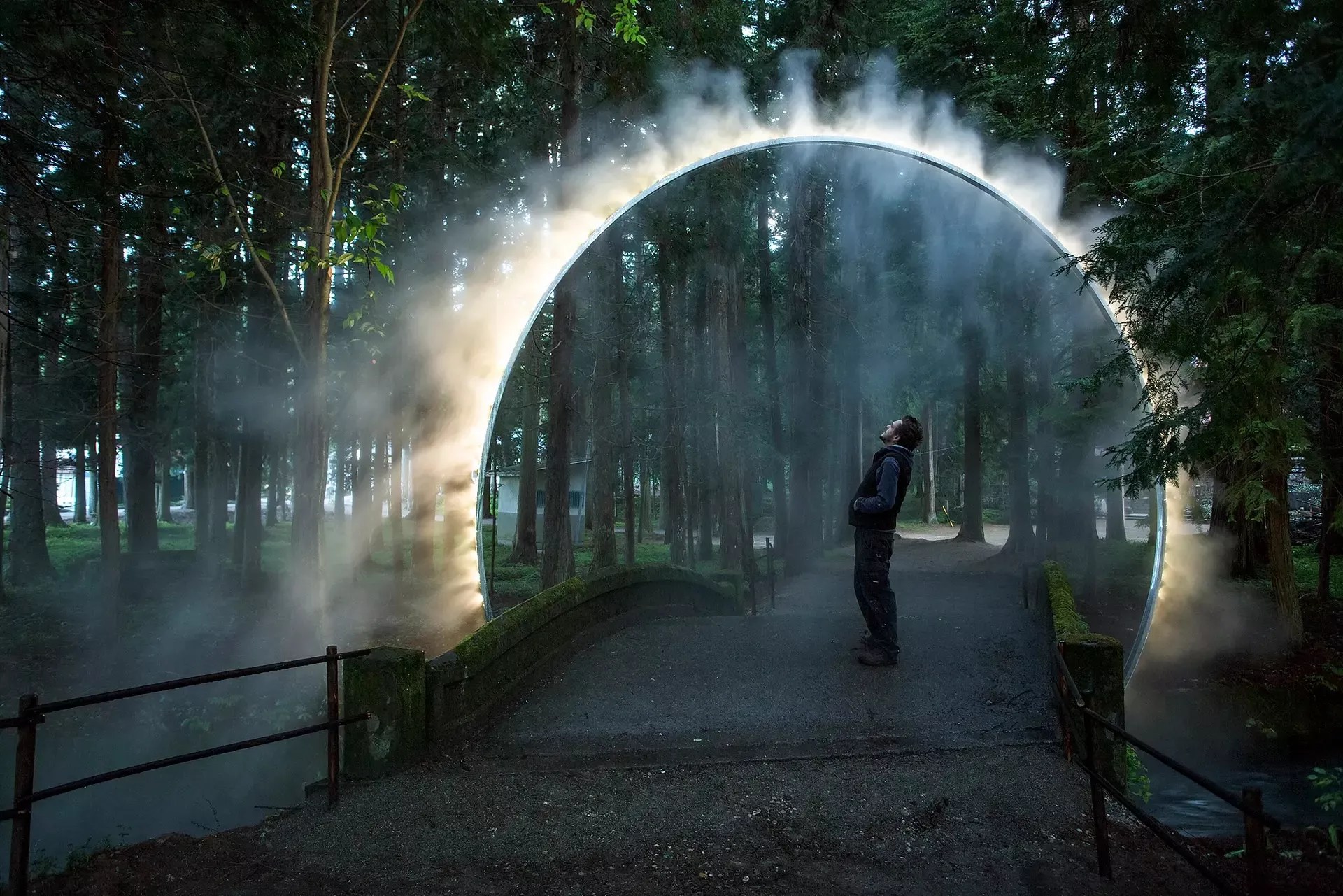 James Tapscott, “Arc ZERO: Nimbus,†Omachi, Japan, 2017. Mist, light, mirror, steel, rigging, pumps, nozzles, filters.