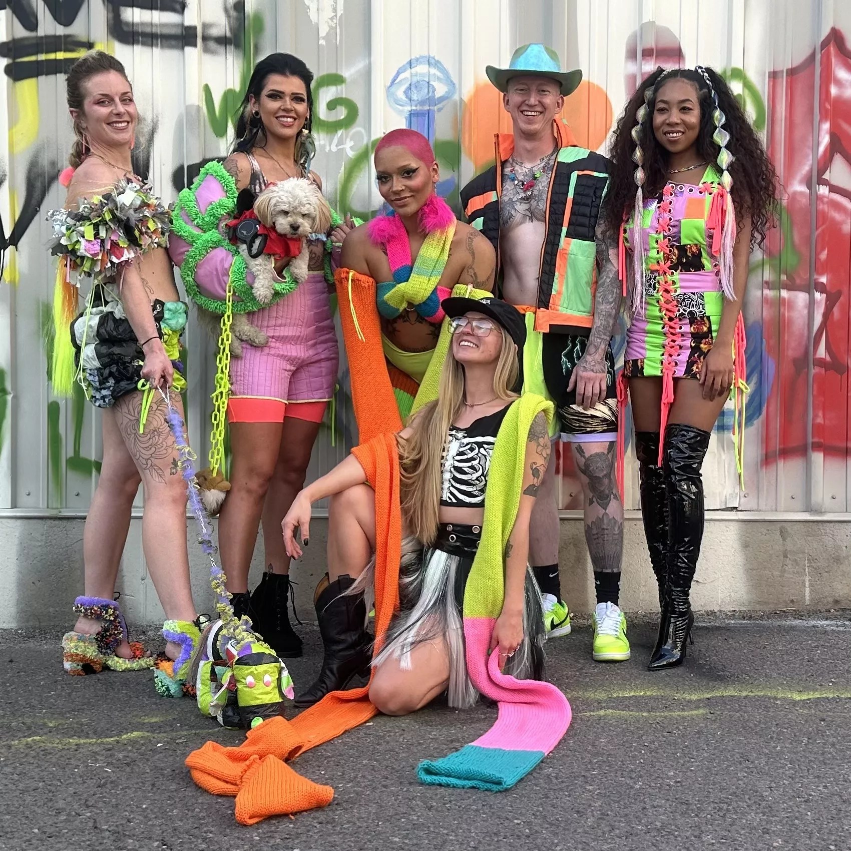 A group photo from Ordinary Disguise, a fashion show that Andrea Fischer curated at the 2024 No Vacancy art residency.