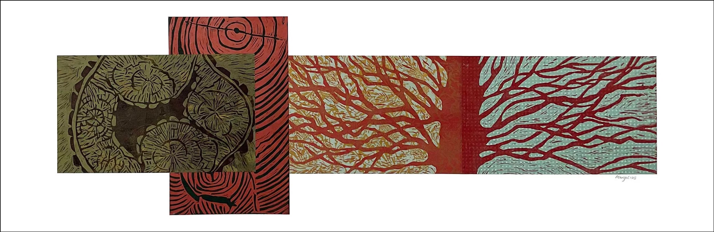 Art couple Sushe Felix and Tracy Felix again show their popular stylistic takes on landscape painting — Sushe casting an elegantly formed modernist spell over her ubiquitous mountains and clouds, while Tracy’s similar subject matter takes on the curvy shapes and layers of a relief map or a Thomas Hart Benton. Shown together, their paintings complement and converse. In a nod to Month of Photography, Betsy Margolius wows with mixed-media works combined with simple monotypes and linocuts, some layered with chine collé, to create patchworks of dense patterns, often inspired by nature.