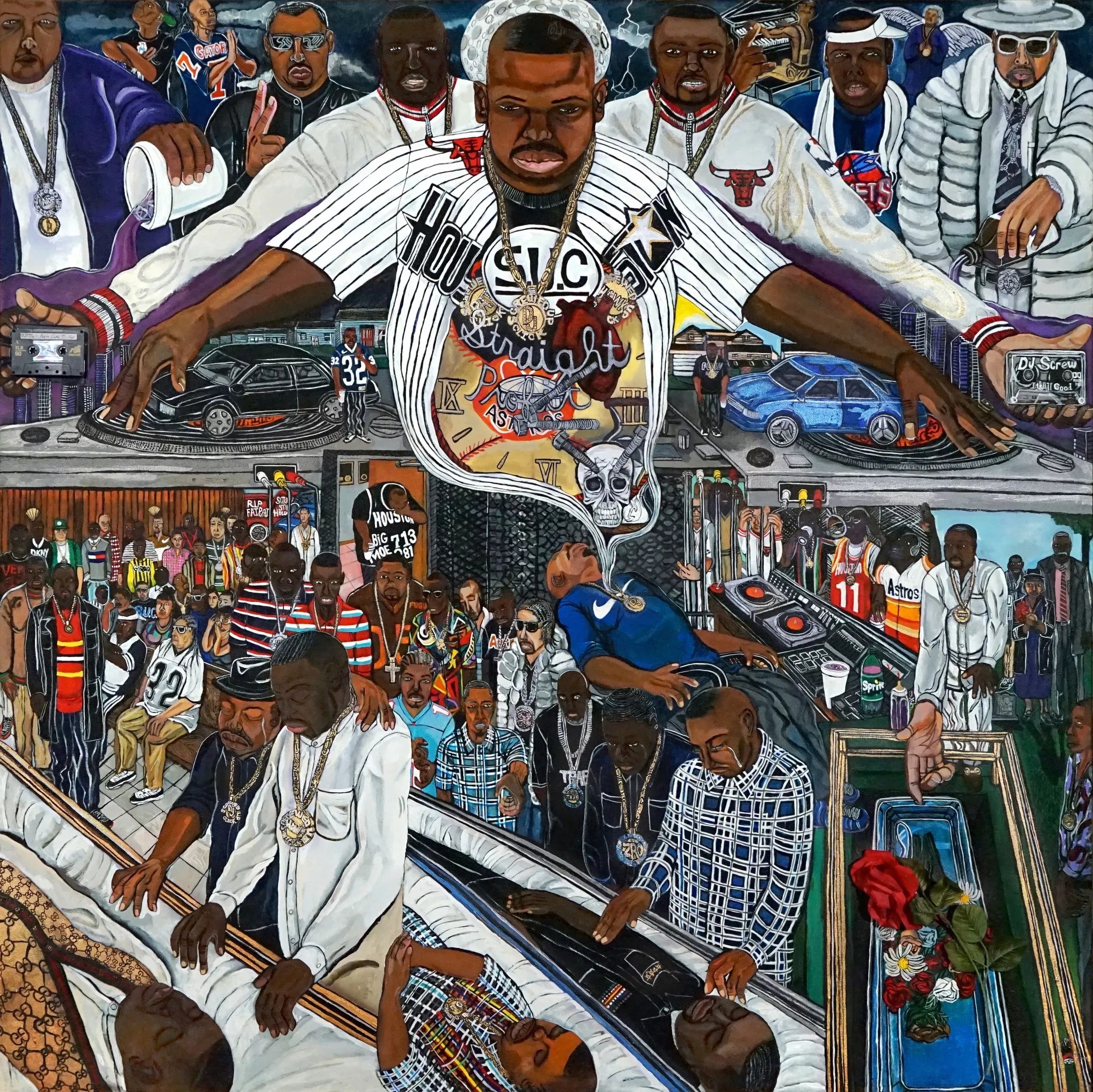 El Franco Lee II, “DJ Screw in Heaven 2,†2016, acrylic on black canvas with cassette tape.