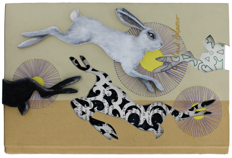Valerie Savarie, “Run Rabbit Run,†altered book, acryla gouache, watercolor, thread.