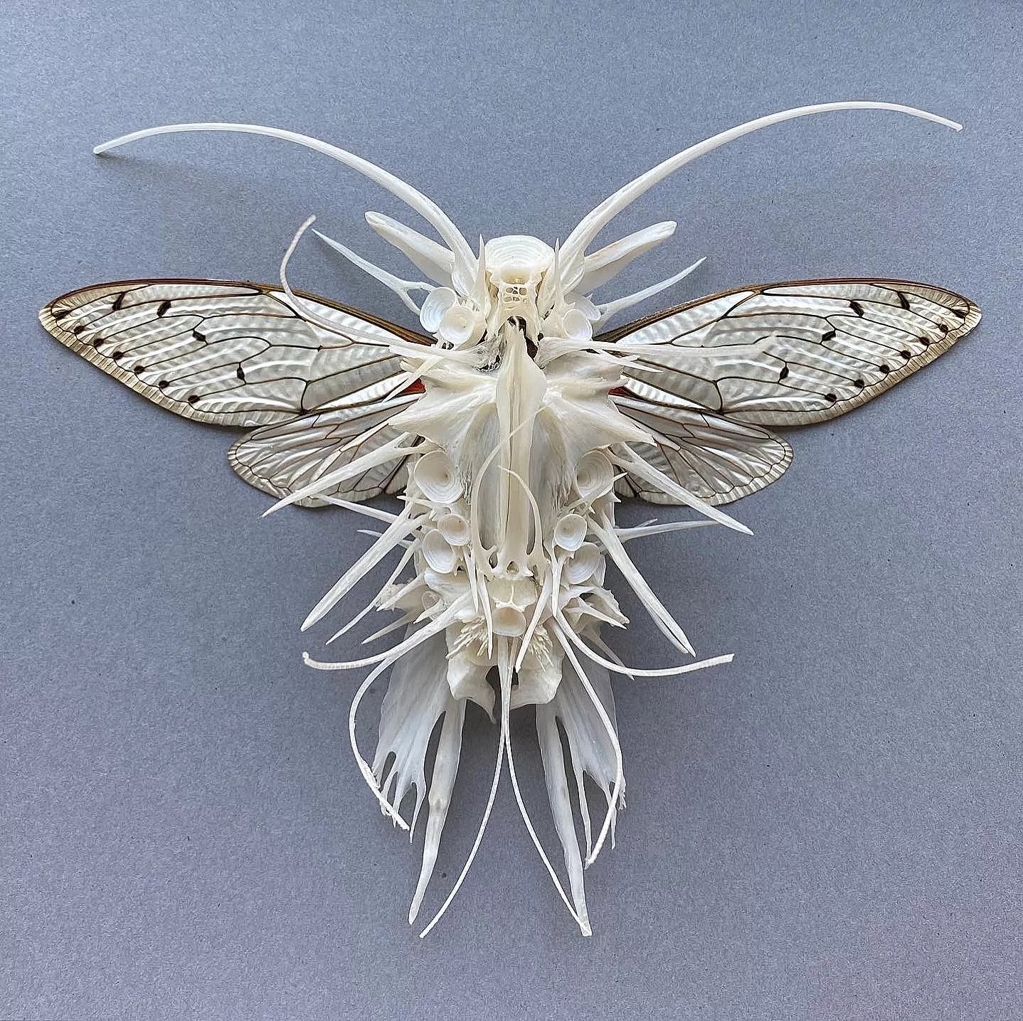 Next Gallery member Adrienne DeLoe’s insect assemblage is made from a real cicada specimen and fish bones.