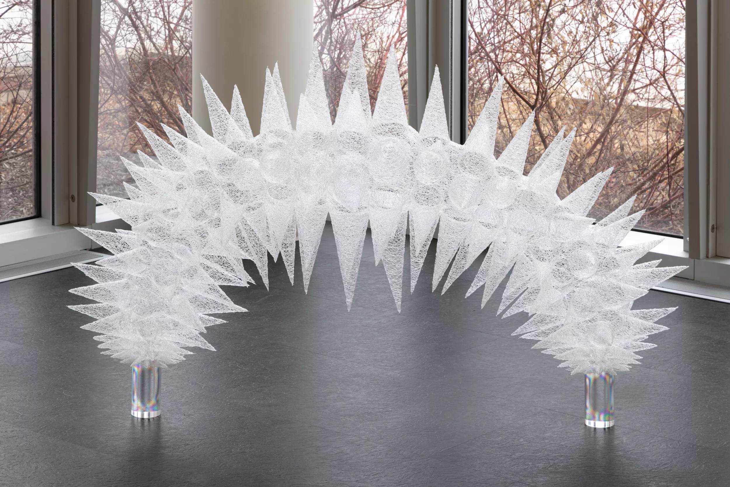 Jodi Stuart blends digital and handmade practices — and a lot of cheerful color — into her woven sculptures created using plastic filaments usually fed into 3-D digital printers. It’s a bit of a joke how she uses the digital tool to hand-weave a sculpture, and the title, Toxic Positivity, drives in the punchline: The synthetic materials she uses to replace thread or organic basket-weaving stems might make for a pretty picture, but there’s a specter of perfect, experience-bleeding technology hiding behind the curtain.