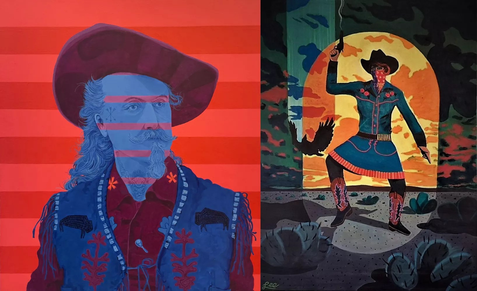 Both practitioners of imagining a contemporized West, Earl Chuvarsky and Ryan Austin Lee team up for a two-man show at Valkarie Gallery. In juxtaposition, their works cover the gamut from heroes of the Old West in pop-art colors to the new wave of car-racing cowboys and Indians, and immigrants crossing the wall.