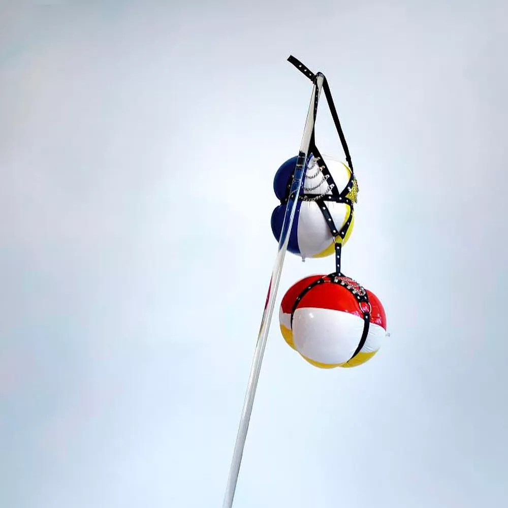 SupaStore Human Custom Sunglasses Workshop Sarah Bowling, “wingset (no swing or slide),” concrete, acrylic rod, beach balls, leather harness. Sarah Bowling