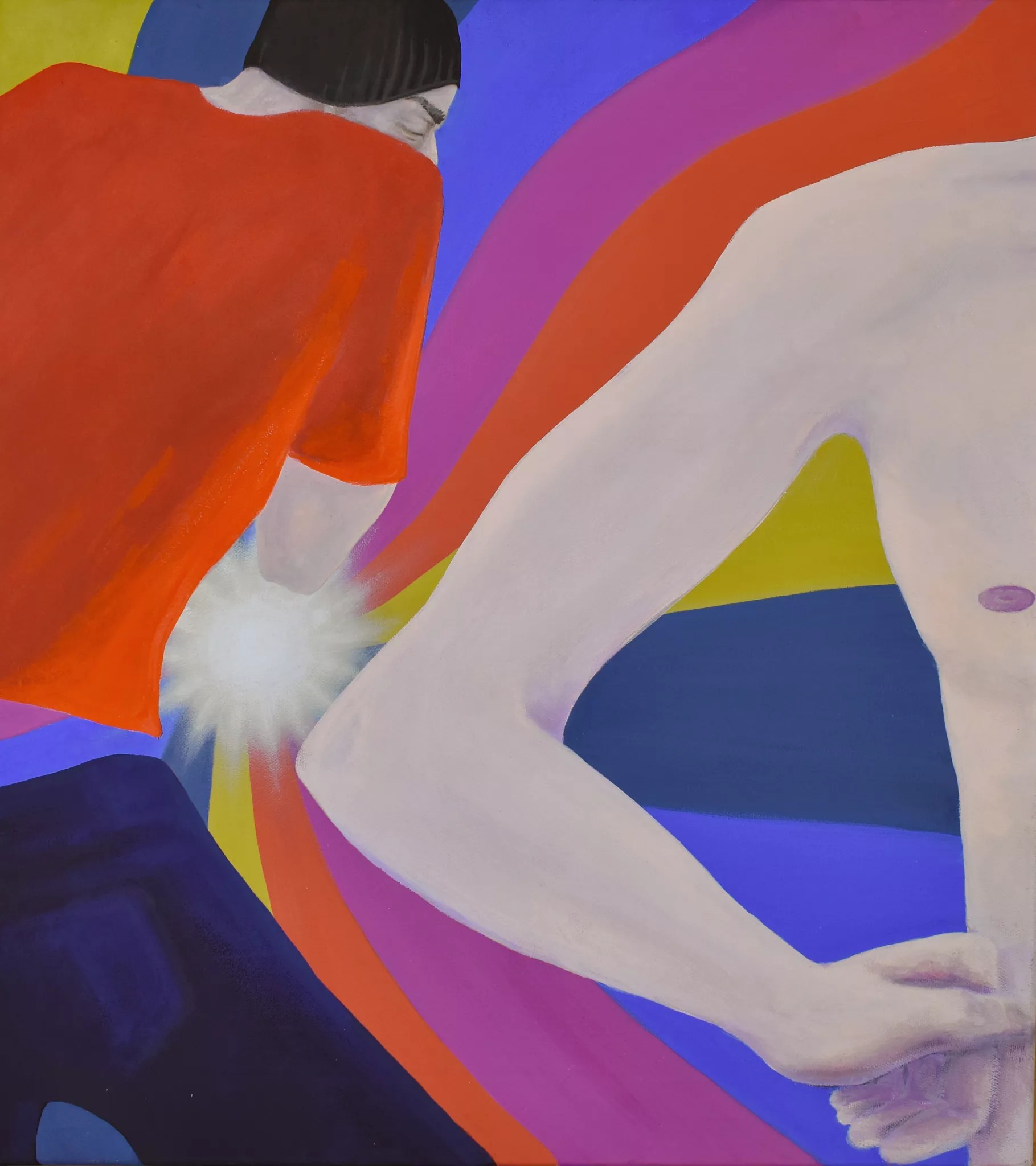 Chuck McCoy works on understanding his diagnosis of macular degeneration through Passing Through the Hues and Objects of the World, a series designed to imagine the deterioration of vision over time. He says the title is based on the first line of Walt Whitman’s poem “Eidólons,” noting that the word “eidolon” describes a phantom, and he found that evocative of phantom visions, or the state of seeing things that aren’t real. McCoy, who also suffers from aura migraines, adds the peripheral visual distortion they cause into the equation. The result is a collection of therapeutic digital inkjet prints imitating what he knows of the deteriorating eyesight that comes with MD, overlaid in the corners by mists of ghostly rainbows. Fellow Core member Elizabeth Ansley’s solo also comprises more inward-looking therapeutic threads in paintings mirroring feelings related to processing trauma and moving on.