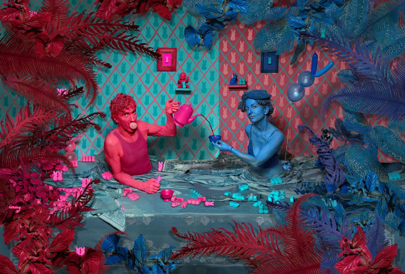 John Bonath, “Tea Party” (models Randy Rushton & Sabin Aell), canvas print handworked with oil paint, gel and wax, multimedia installation. At Red Rocks Community College for Month of Photography Denver.
