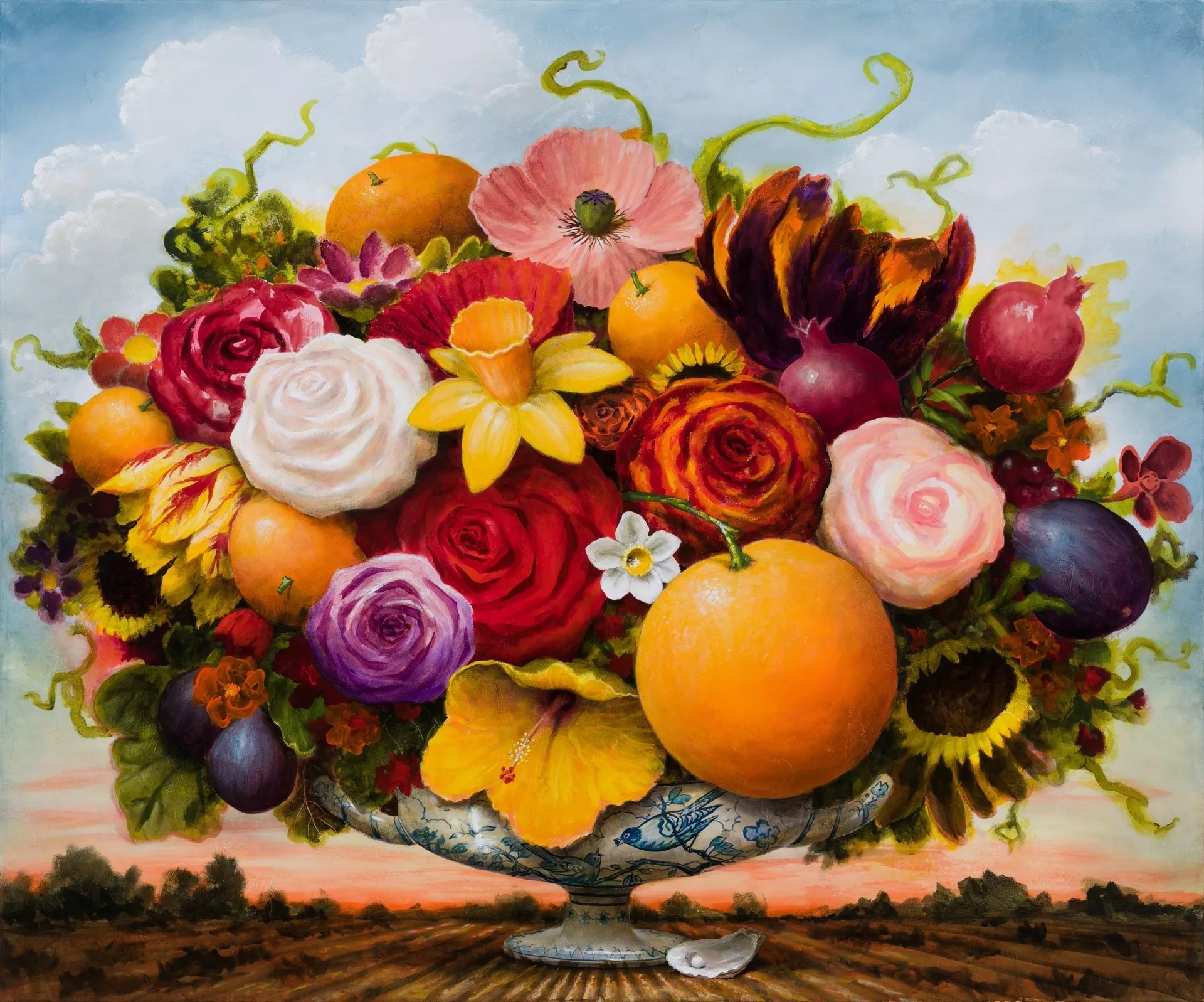 In the main gallery, K Contemporary showcases surrealist Kevin Sloan in Fervent Emblems, a collection of new work drenched in brightly colored floral bouquets — some potted, some displayed in dishes and others in frames — all set against lush landscapes. In contrast, Kuzana Ogg’s breezy, bleeding wash paintings float through the project space like a foggy morning, acting as welcoming portals.