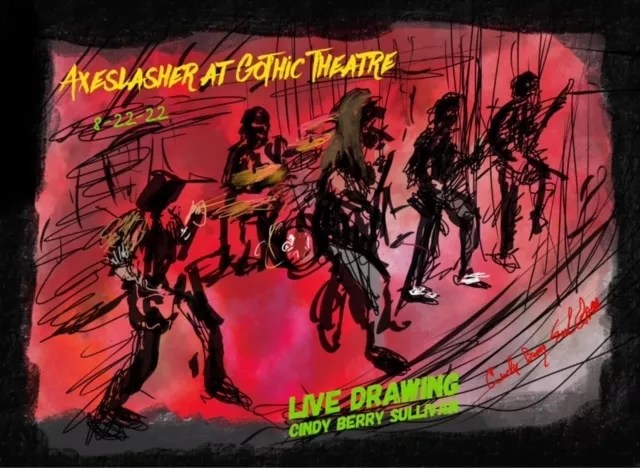 Cindy Berry Sullivan isn’t a metalhead — or a musician, for that matter. But after attending a show at the Gothic Theatre over the summer, the Parker-based artist couldn’t help but appreciate the intensity that the metal bands created that night. She captured the lively scene in four digital drawings of the acts on the bill: Axeslasher, Enforced, Municipal Waste and At the Gates.
