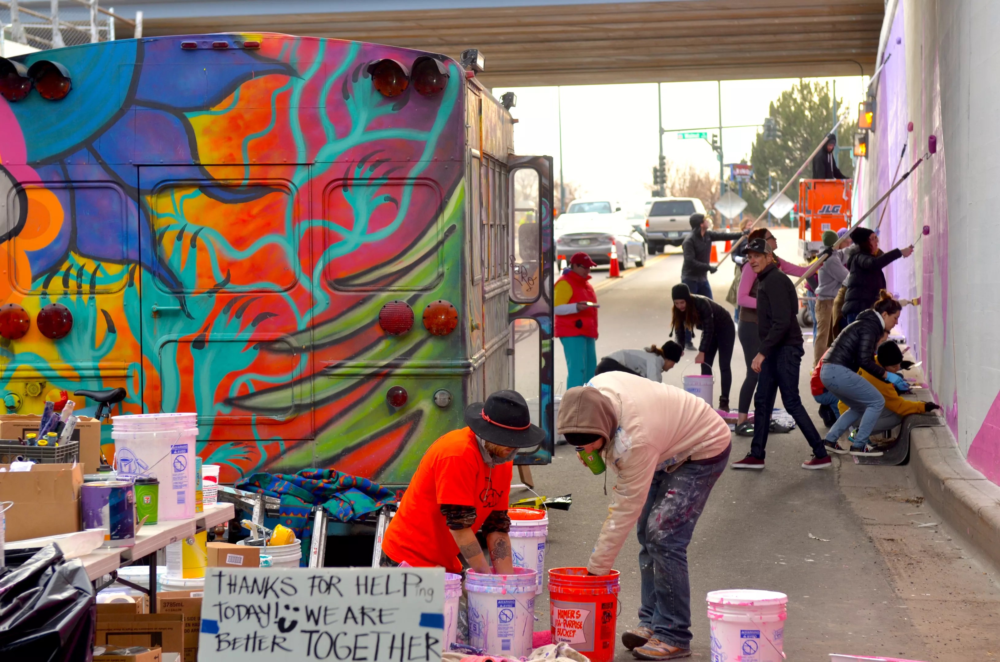 A light installation, created by artists Katy Flaccavento and Zachary Christopher of Knomad Colab and funded by a P.S. You Are Here grant through Denver Arts & Venues, will complement 996 feet of murals designed by Pat Milbery and Jason Graves of So-Gnar Creative Division and painted by hundreds of residents. One mural on the north side of the underpass was done in 2016, and one on the south side was completed earlier this month.
