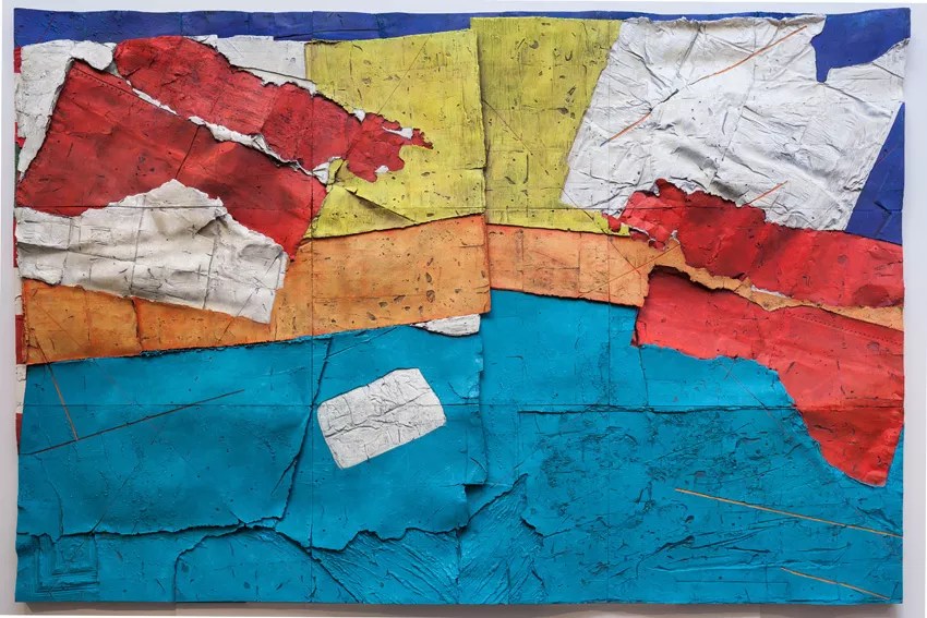 In the adjacent atrium space is the magnificent multi-panel, three-dimensional abstract bas-relief “Monsoon Warning,” by Ray Tomasso, the dean of Colorado paper makers. This is the sort of work I’d expected to find in this show. Tomasso, with the aid of assistant Phil Than, made molds by creating abstract assemblages using found material like construction debris. After a multi-step process, the molds were covered in paper pulp made from ground-up blue jeans. When the pulp was dry, the various forms that emerged through the casting were painted different colors. The composition includes wide red slashes and color fields in a gorgeous blue-green and a subtle, recessive mustard, among other tones. The result is a hybrid of an abstract sculpture and an abstract painting, and it’s a classic example of Tomasso’s signature style.