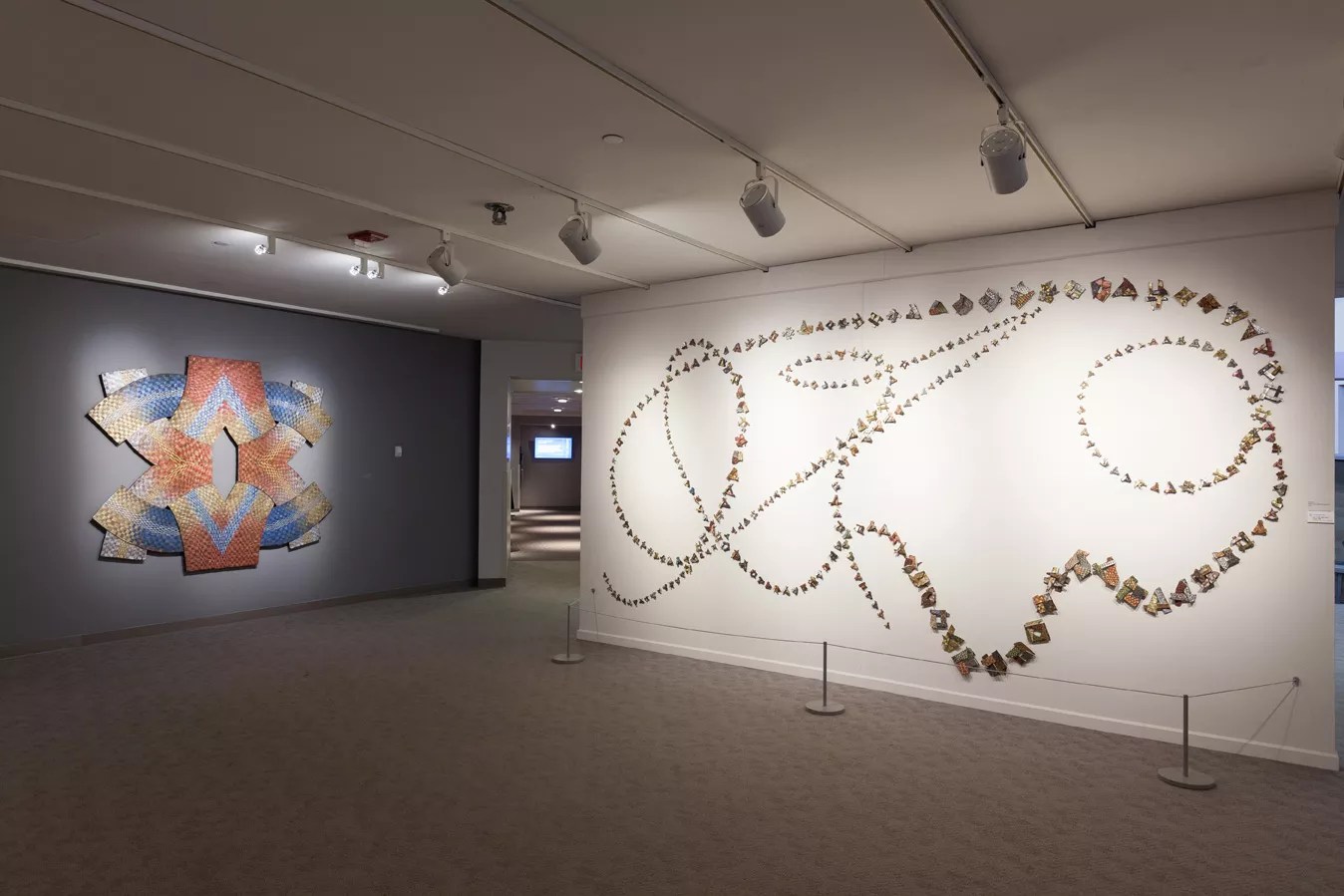 In the spaces along the west side of the Lower Galleries are several standout contributions, including Robert Brinker’s elaborately pierced cutouts from enlargements of glossy, commercially printed papers; the piercings depict such ancient Chinese symbols as the dragon form. Nearby are patterned compositions by Mike McClung (the “Michael” in Michael Warren Contemporary), created when the artist burned holes into the paper to create the imagery. More patterns are seen in the folded paper bas-reliefs by Matthew Shlian and the similarly conceived Jenene Nagy pieces. A suite of white-on-white embossed-paper panels by Sophia Dixon Dillo are stunning in their quiet beauty. And although newcomer Mike Neff is not creating patterns, his taste for geometry is evident in his impressive cut-paper designs based on the letters of the alphabet.
