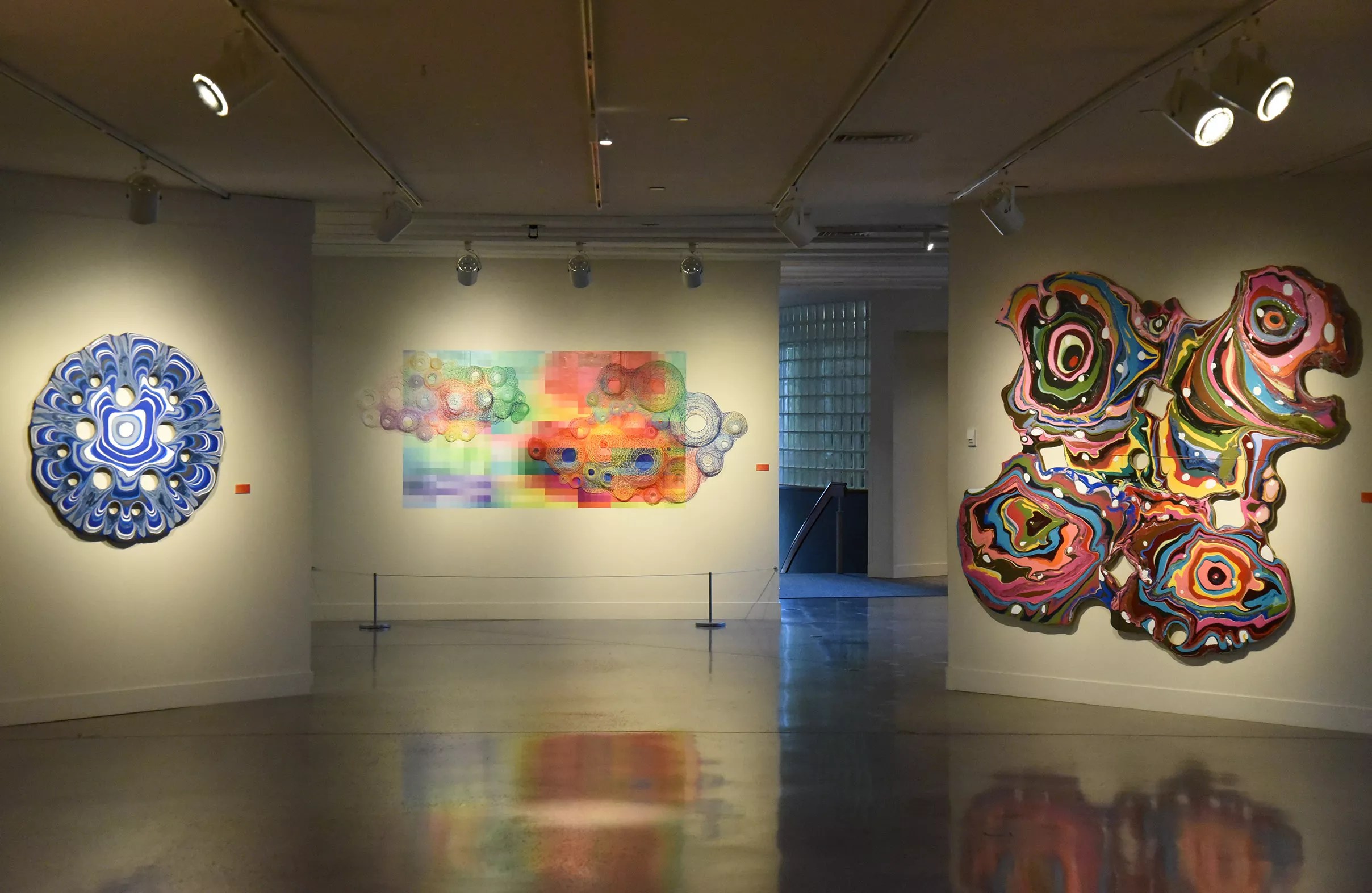 Ivanovic’s op-y mandalas also embrace a novel production method. She pours paint onto boards, then uses drinking straws and toothpicks to move, stop or otherwise control the puddles of liquid so that they take the form she wants. If the resulting paintings were round, they’d have a concentric quality. But these are more complex in their shapes, though they reflect the same idea of a rhythm created by a set of colors repeated in the same order. She achieves this by pouring one color, then another on top, and then another, and another, and so on. Several of the pieces at Arvada have cut-out portions piercing the thick boards on which they’re painted, with the holes arranged in patterns.