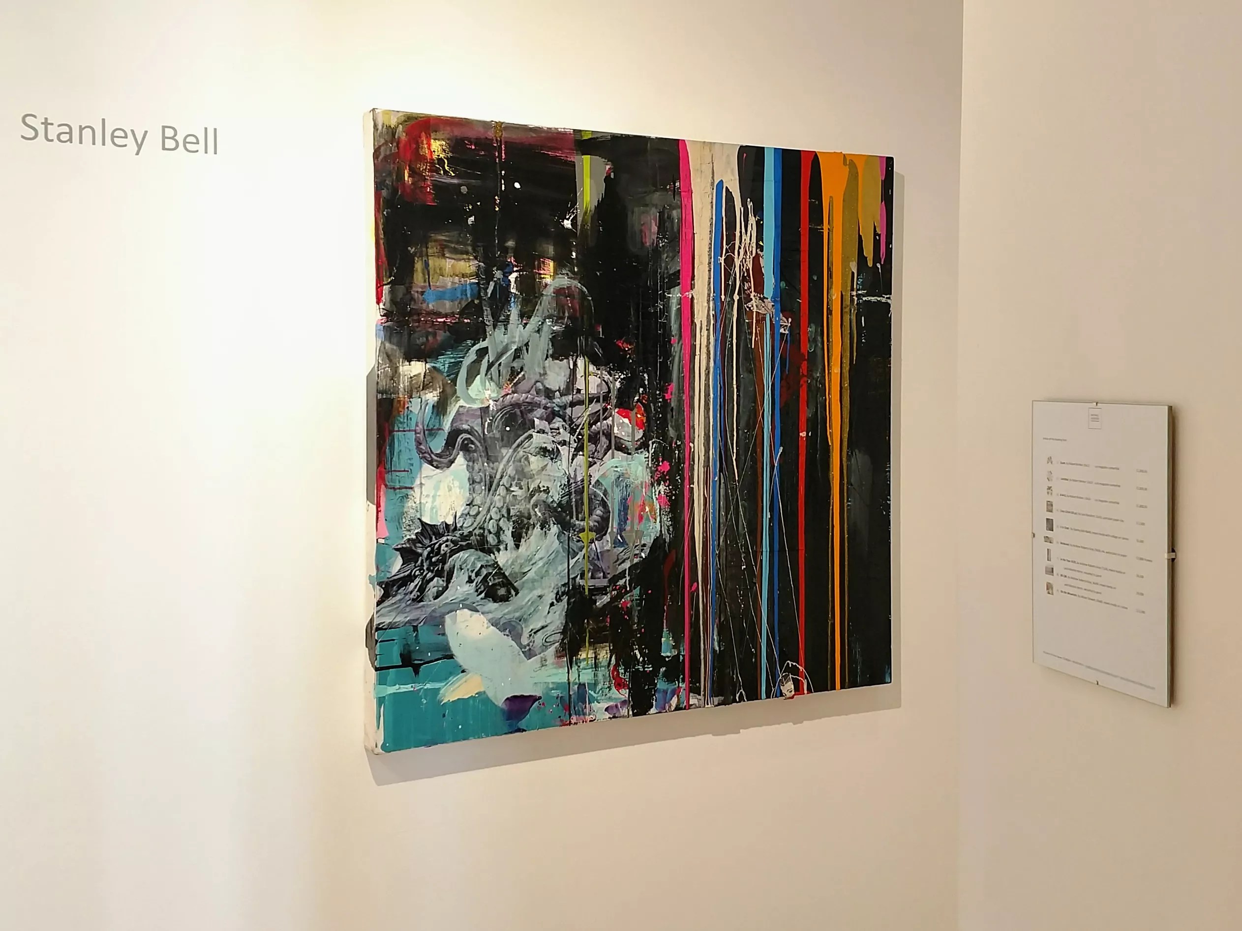 Stanley Bell employs hidden images and juxtaposes abstraction to representation as well. In the knockout “It Is Clear,” Bell has divided the composition into two parts: On the left is an enlargement of an appropriated image of an octopus that looks threatening; on the right he’s poured various colors of paint from the top of the panel in order to make a line of bright stripes obliterating the part of the image that lies underneath.