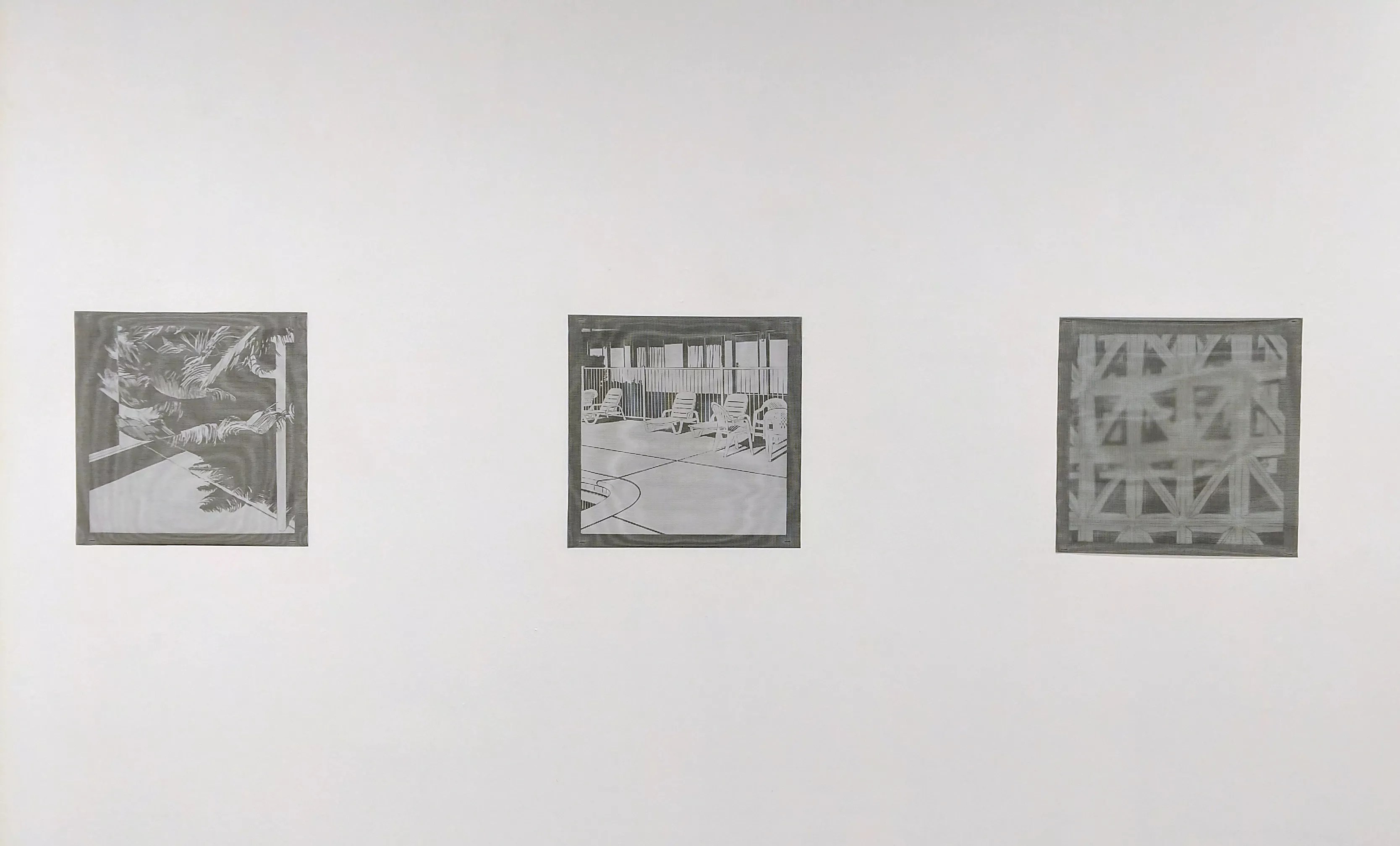 The works included here, all from her “Illusions” series, are fairly strange, but their strangeness is subtle and derives from the materials she uses more than from the subjects she’s picked. Starting with simple drawings of mundane sights – including a decorative grill, the side of a building and lounge chairs set up poolside – Ferrill hand-cuts silkscreen film to convey a halftone of the representations. She then pulls the prints with a squeegee, but instead of printing on paper, she employs little squares of metal window screening. The basket weave of the screens provides the prints with gridded grounds, and the transferred images become somewhat ethereal, a quality heightened by the contrast between the broken areas of white ink and the shiny gray metal.