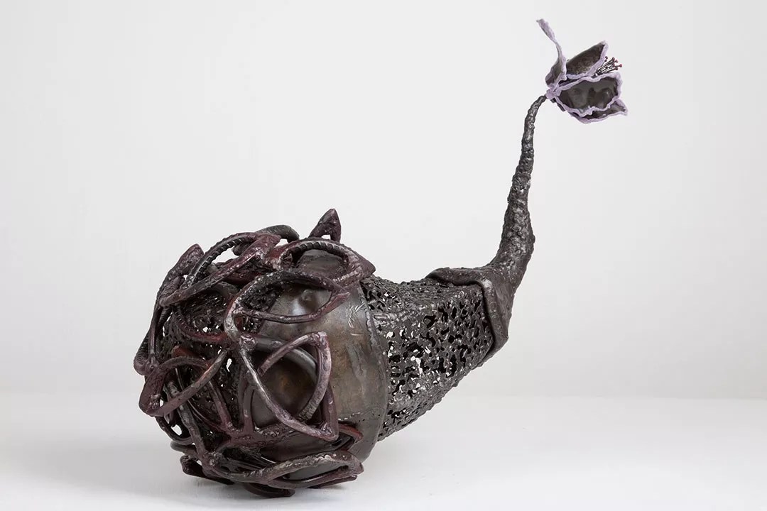 “Stranded Bulb With Blossom,” by Rachel Stevens, steel and flock.