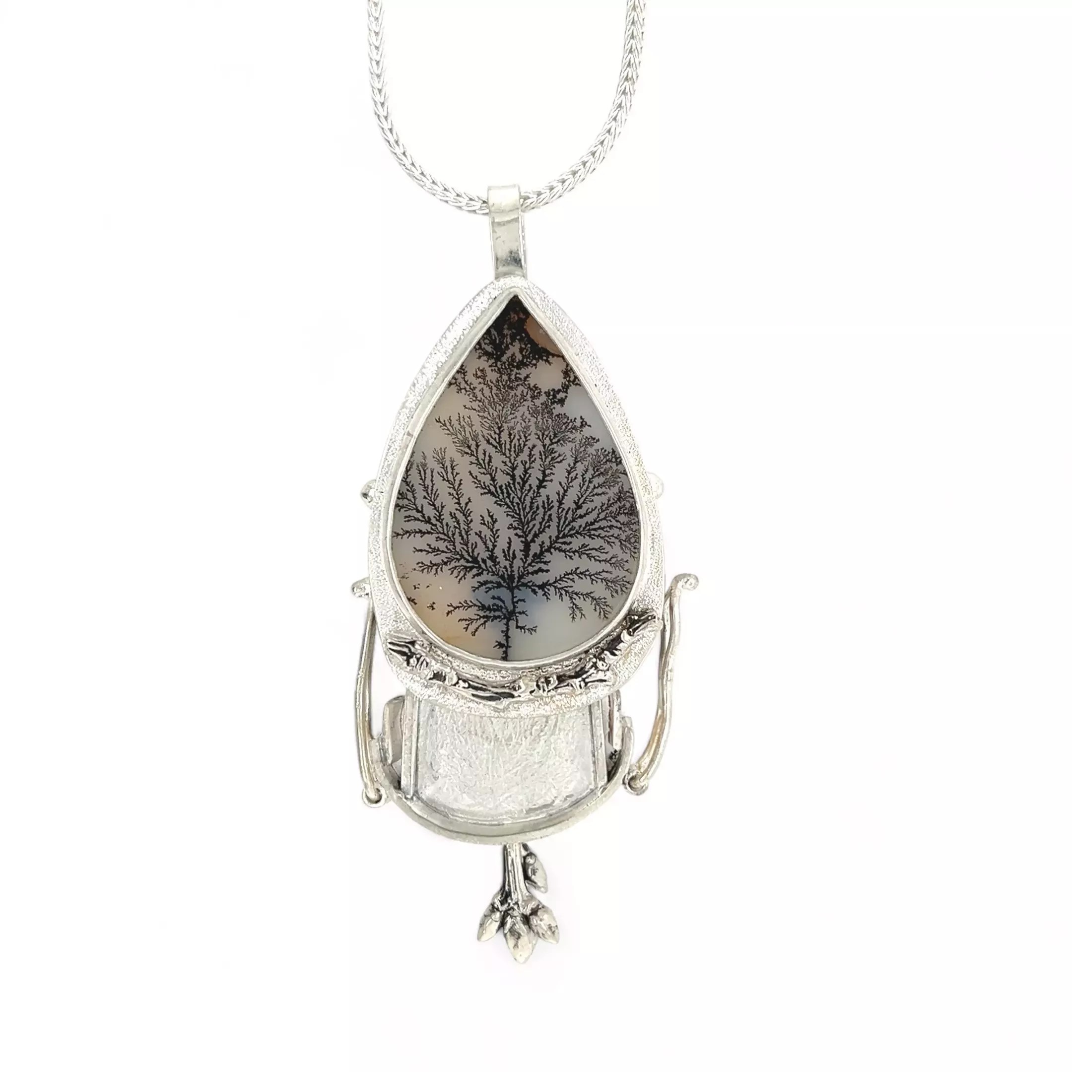 A handmade fossil pendant with container, by Krista Lavonas.