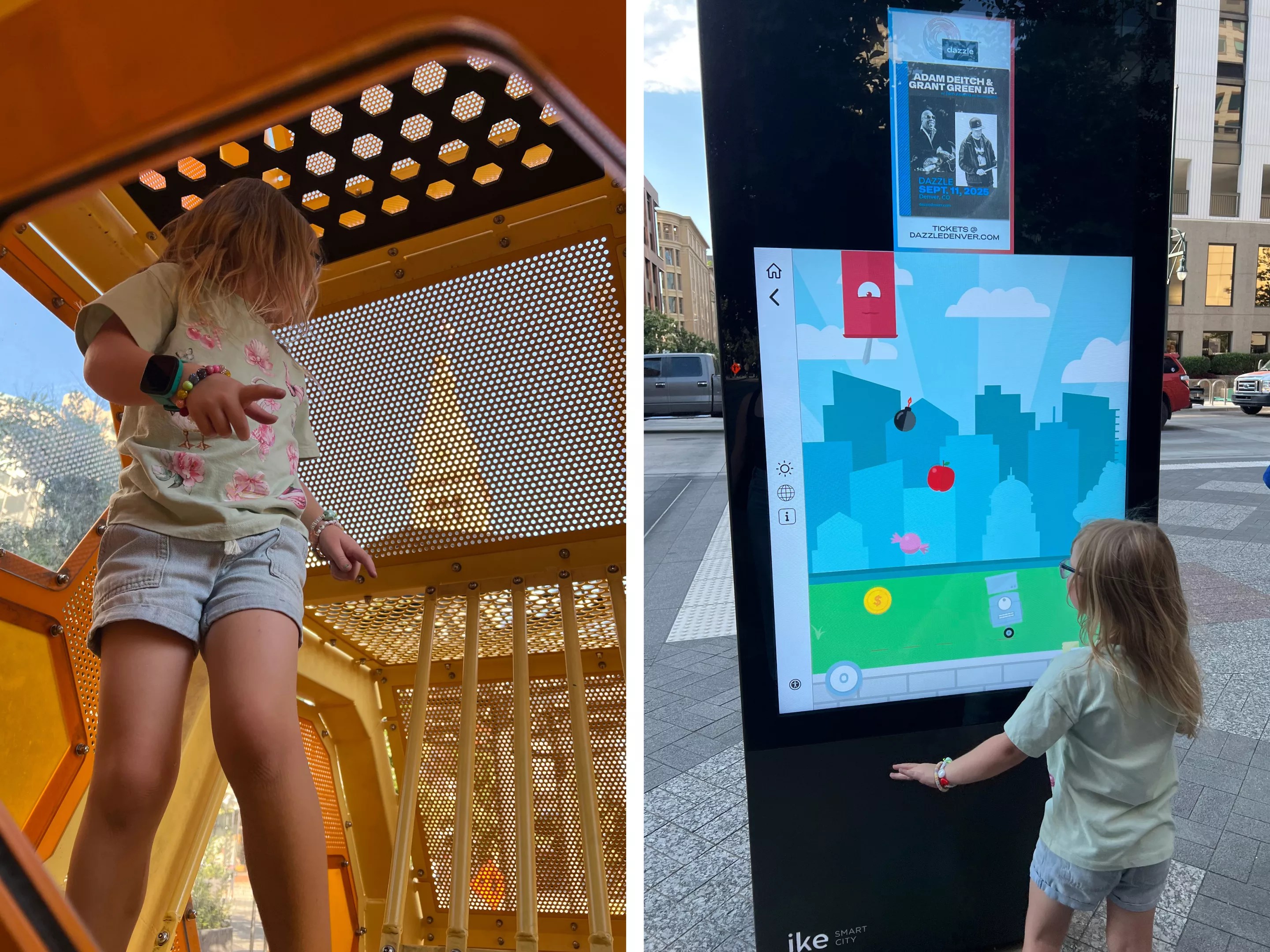 You read that correctly. It looks like the 16th Street makeover was worth it because it earned the mall a score of one million, according to Olive. We spent a day walking to each of the newly-added mini play structures along 16th Street, including the Aspen tree bird nest at Glenarm Place, the bee hive at Lawrence Street, the metal drum platforms at Curtis Street and the cowboy fish at Larimer Street. We also played video games and took photos using some of the touch screens lining 16th Street.