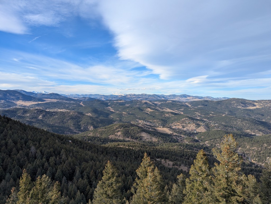 The view from the top of Independence Mountain gives a birds-eye perspective of Evergreen, plus a stellar view of the mountains beyond it.