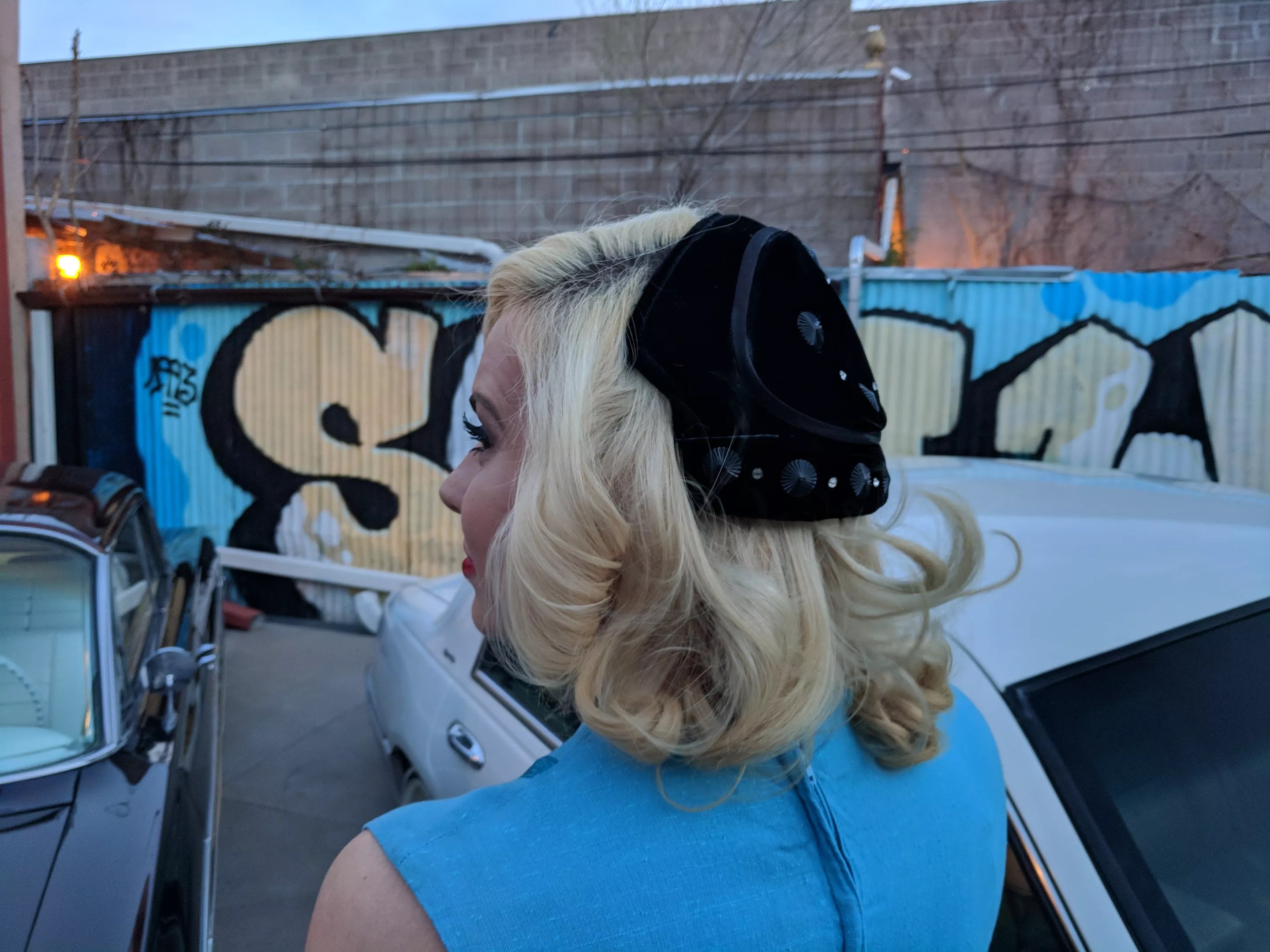 Betty Garcia channels Marilyn Monroe in this baby-blue dress from La Chic Thrift and Vintage.