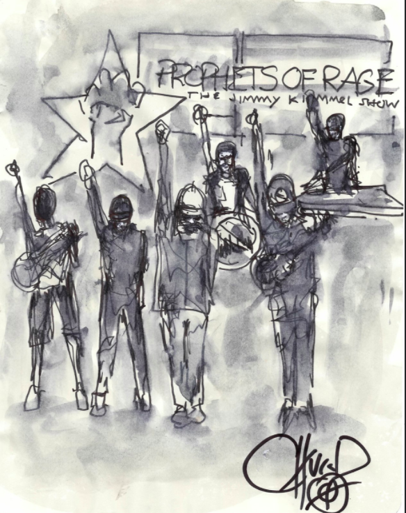 A watercolor painting titled “Jimmy Kimmel Prophets of Rage.”