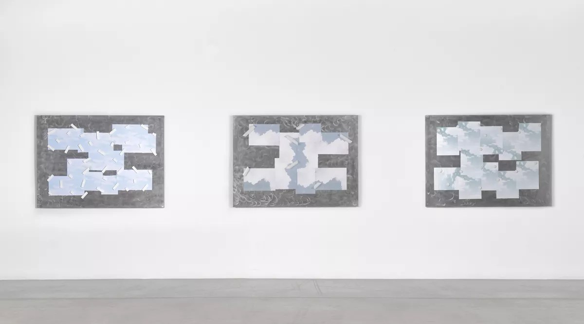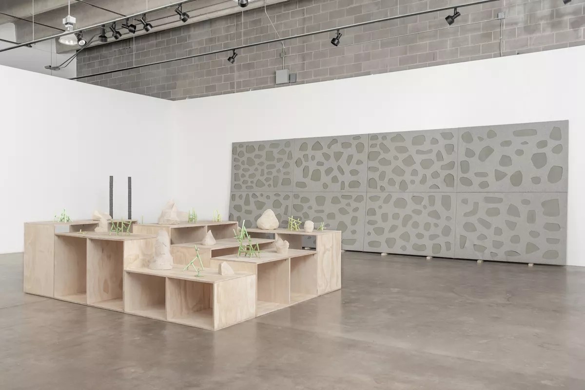 One piece in Valley Boy obtusely refers back to “ROAM,” but only because it’s also 26 feet long. “The Approach” is a multi-panel wall sculpture made of poplar sheets covered in painted canvas that has been overlaid by gray industrial felt; the felt has been pierced with an all-over (though non-repeating,) pattern of organically shaped holes. It may be a stand-in for a cloud-dotted sky, since on the opposite wall are the three “Hondo Condo” pieces, in which prints depicting clouds are held to metal sheets with ceramic-covered magnets. “The Approach” and “Hondo Condo” bracket the main installation in the center of the gallery: “Boulders & Blossoms,” which is meant to convey – broadly speaking, anyway – the scenery of the San Luis Valley, which the artist regards as his adopted home. Spending time in the San Luis Valley as a child is only one of Geiger’s associations with Colorado; he did his undergraduate work in the renowned ceramics program at the University of Colorado Boulder, later earning an MFA at Cranbrook Academy of Art, which is how he wound up in Michigan. Third Dune Productions