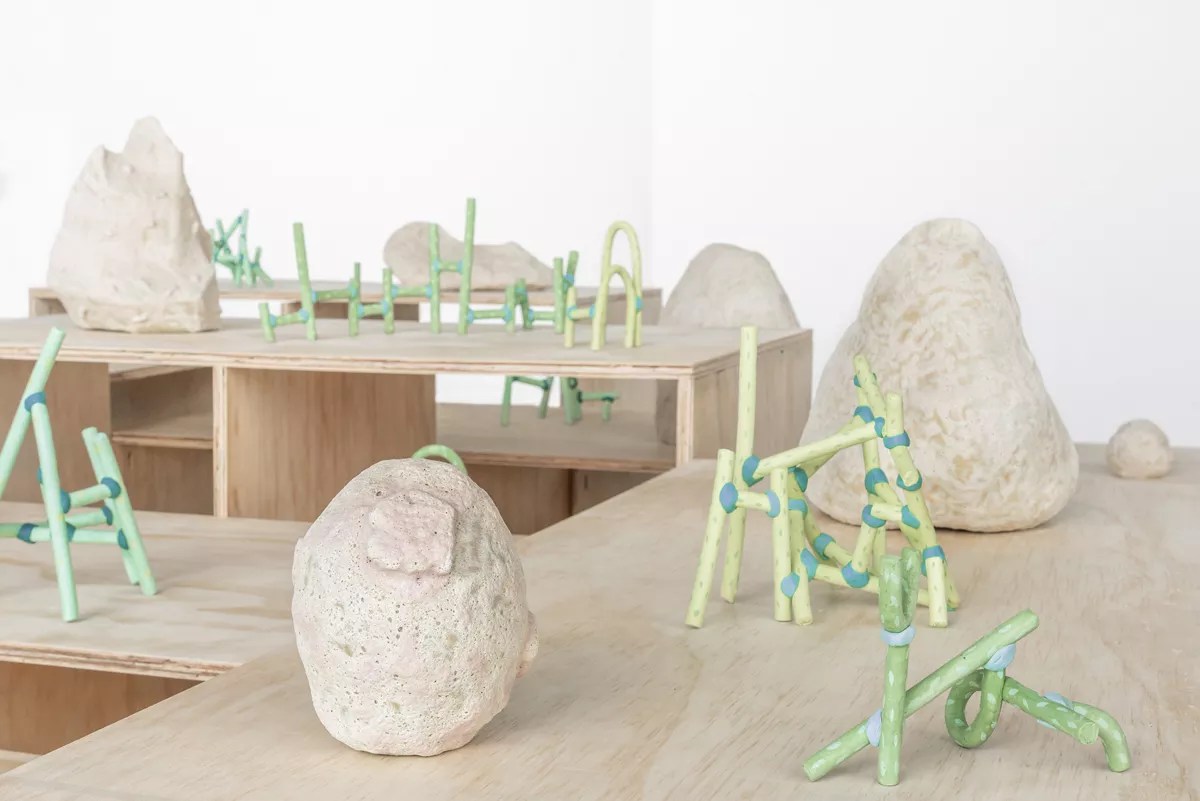 Geiger cites minimalist master Donald Judd in “Boulders & Blossoms,” with very Judd-ian open plywood stands on which many small ceramic sculptures have been placed. The proportions of the simple stands are based on the dimensions of various tables and shelves in Geiger’s studio. The ceramic sculptures correspond to the boulders and blossoms of the installation’s title. The boulders are lumpy, rock-like shapes with gorgeous, foamy-glaze effects. The blossoms are as different as plants are from rocks, made of ceramic rods held together by Magic Sculp, which is kind of like putty. The rods and Magic Sculp are carried out in four shades of green, which is the only way they suggest plants, since their forms are structural and non-naturalistic.