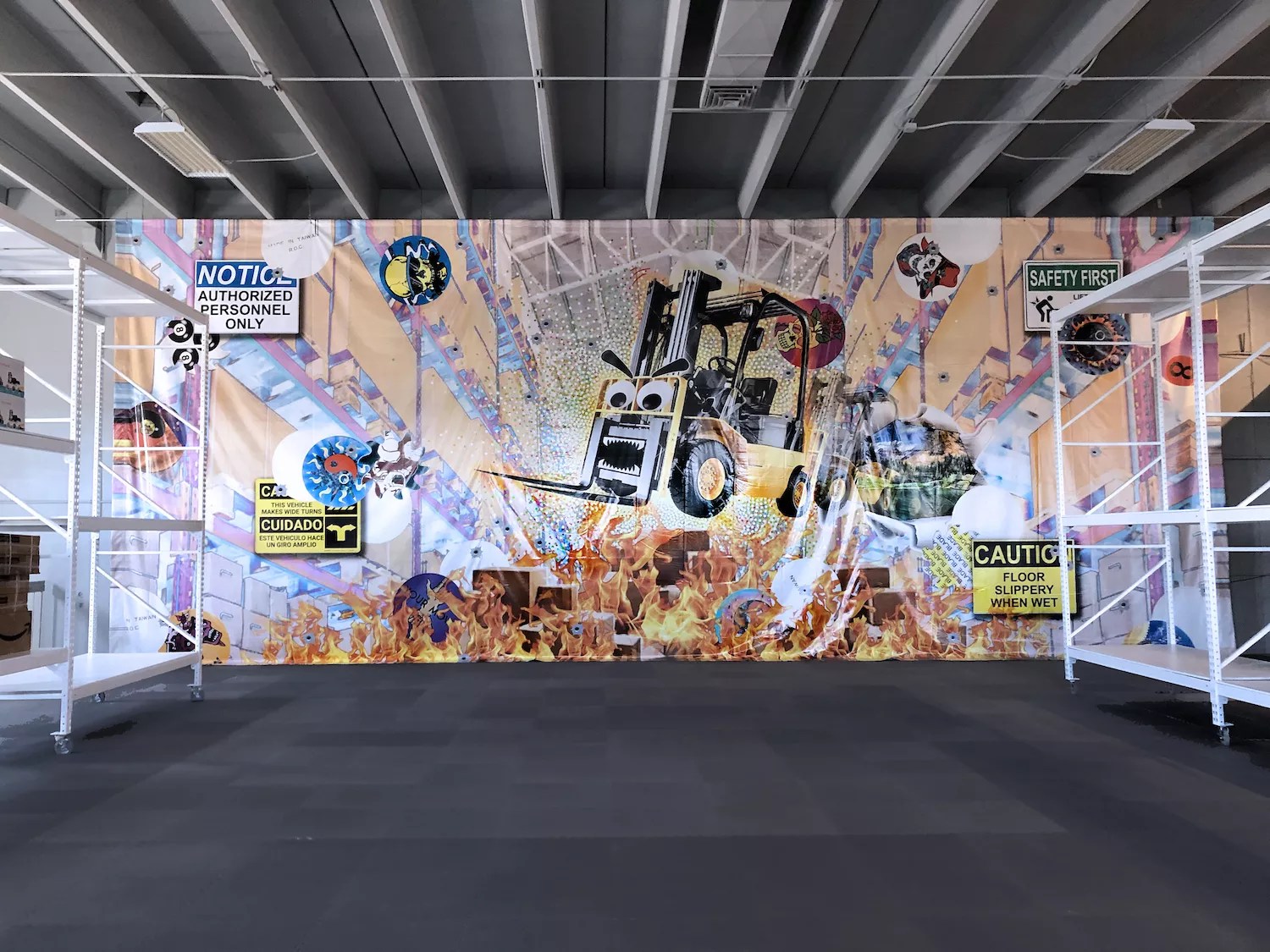 “We talked with each artist about the intellectual underpinnings and let them run with it,” Stell says. “Every artist had a different perspective.” Consider Zach Reini’s 20-by-45-foot, large-scale mural that’s central to The Fulfillment Center‘s presentation, she notes: “I love to grow and stretch artists, to challenge them to produce work in new scales and materials, and this was about scale, with its ridiculous sentient forklift leaping out of the canvas.”