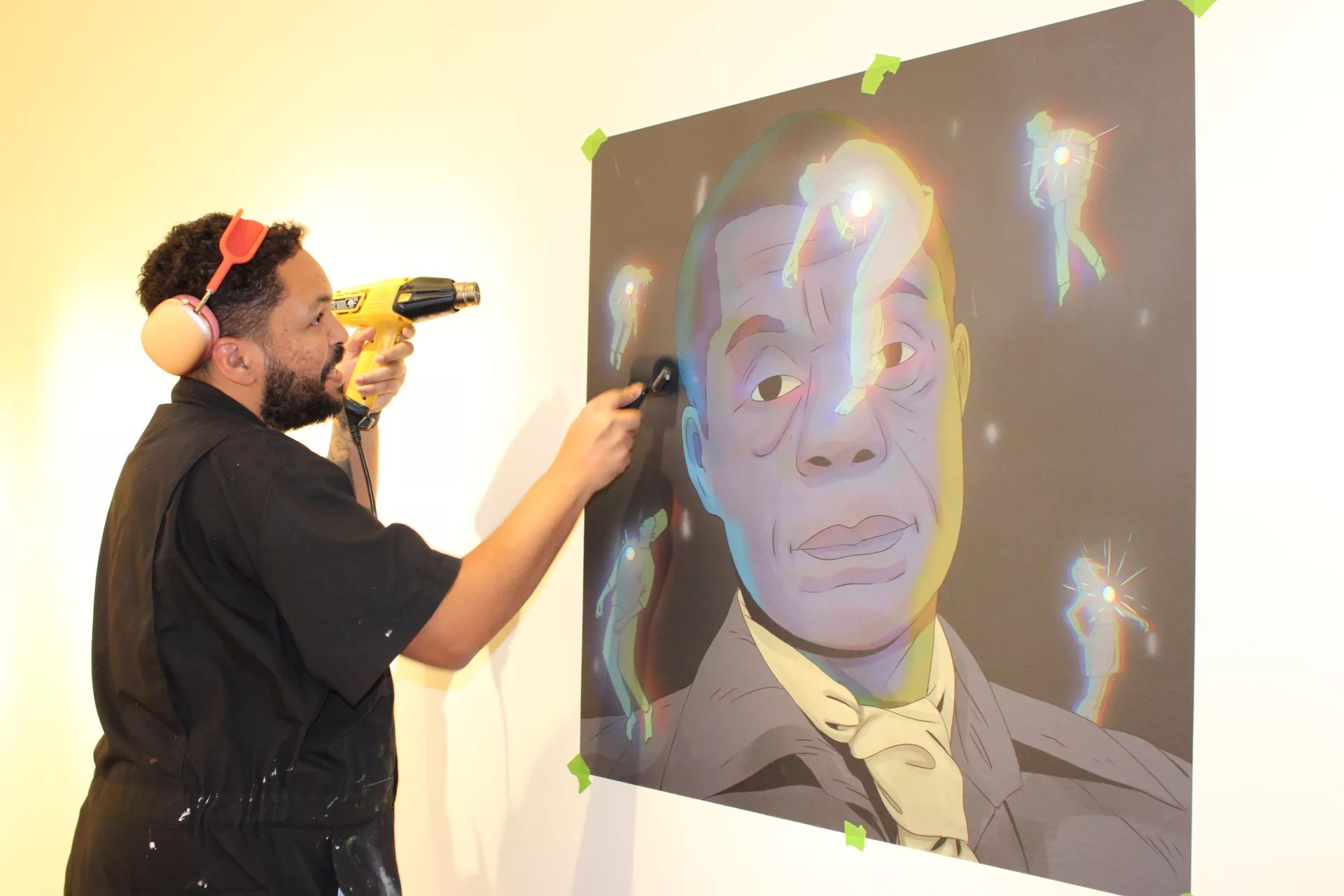During an early tour as the exhibition was being installed, artists moved with purpose, transforming the building into a vibrant showcase of creativity. Marcus Murray was carefully applying his vinyl pop-art illustrations to the hallway walls with a heat gun. “This is my first time installing vinyl on a wall, so it’s been a bit of a learning experience,” Murray shared. “Every February, myself and a couple of other artists do ten days of Black history. It’s our own Black history in our own words or from our own perspective, so each of these illustrations represents a different aspect of my Black history story in a comic-book, pop-art style.”