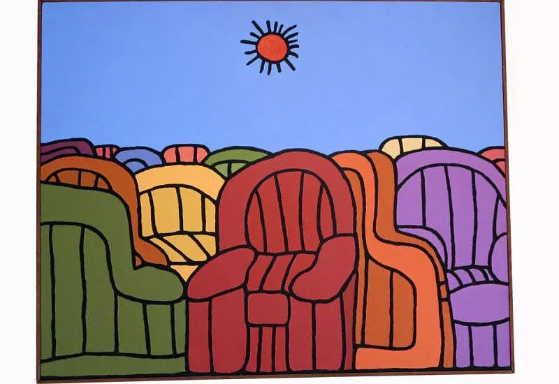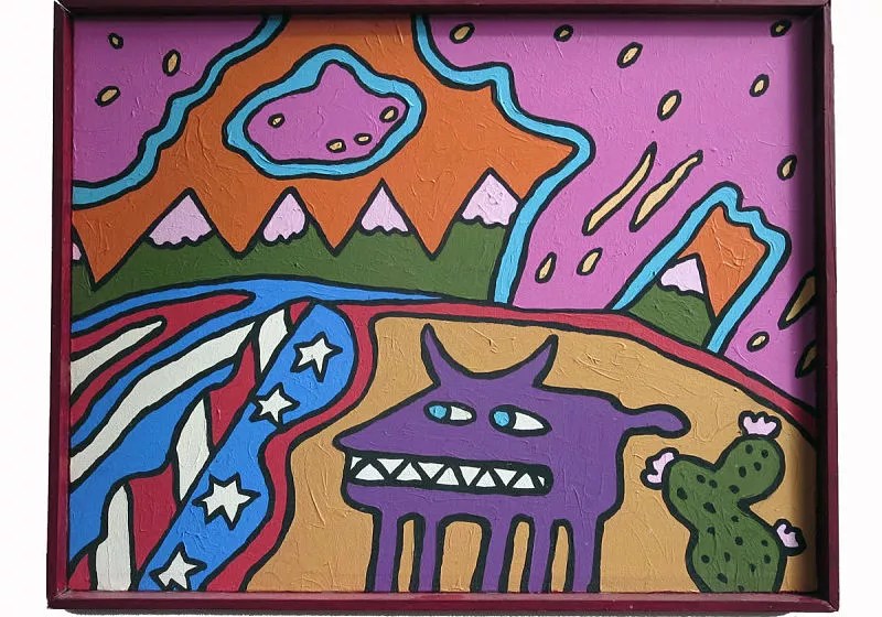 He became a presence in my life in the early 1980s, when my pretty new girlfriend and I visited one of my favorite haunts, the funky Muddy Waters coffeehouse (named after the nearby Platte River and, I imagine, the blues legend) located in the dilapidated far reaches of lower downtown. Hanging on the walls was a collection of colorful acrylic paintings that put me in mind of my favorite moderns of Europe’s “whimsical school” – Klee, Kandinsky and Miró – but infused with a decidedly contemporary air, Á la Keith Haring, say.