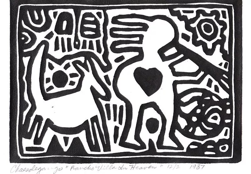 I purchased my first Chaesdegango there. The price was right. Chaesdegango marked his paintings with prices such as $29.95 or $34.50. Bigger, later paintings might go for as much as $45. He said he just wanted to earn enough money to buy more supplies so he could make more paintings. And that’s what he did; the walls of his Humboldt Street house were covered with them. Chaes had a liberal exchange policy: If you wished, you could trade in an older painting straight across for a newer one.