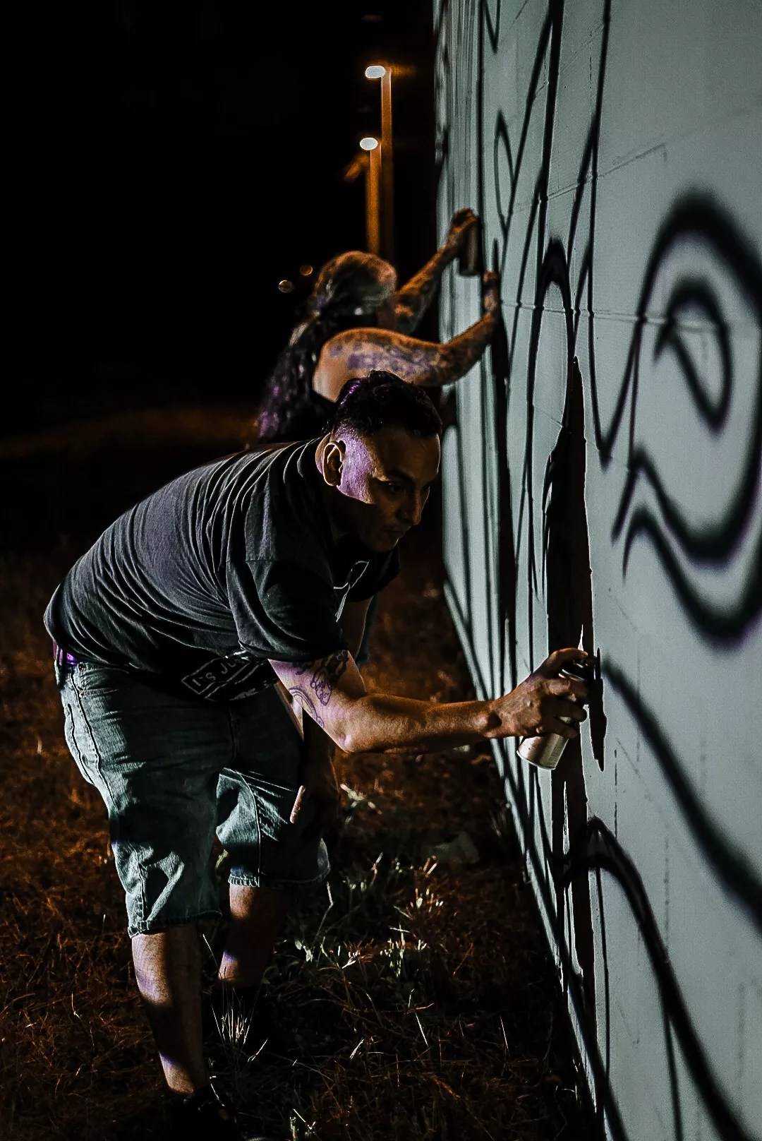 Victor J. Escobedo (front) and Alicia Cardenas work overnight to outline the “Xipe Totec” mural off of Eighth Avenue in the Sun Valley neighborhood.