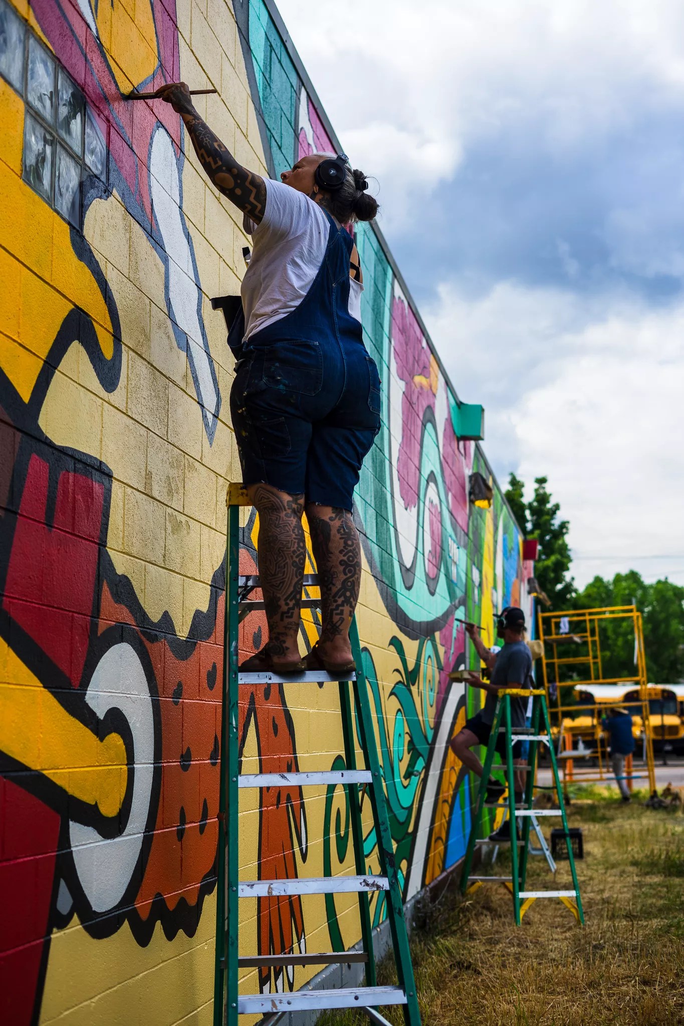 Artist Alicia Cardenas (front) works on the “Xipe Totec” mural on Mana Supply Co. in June 2021.