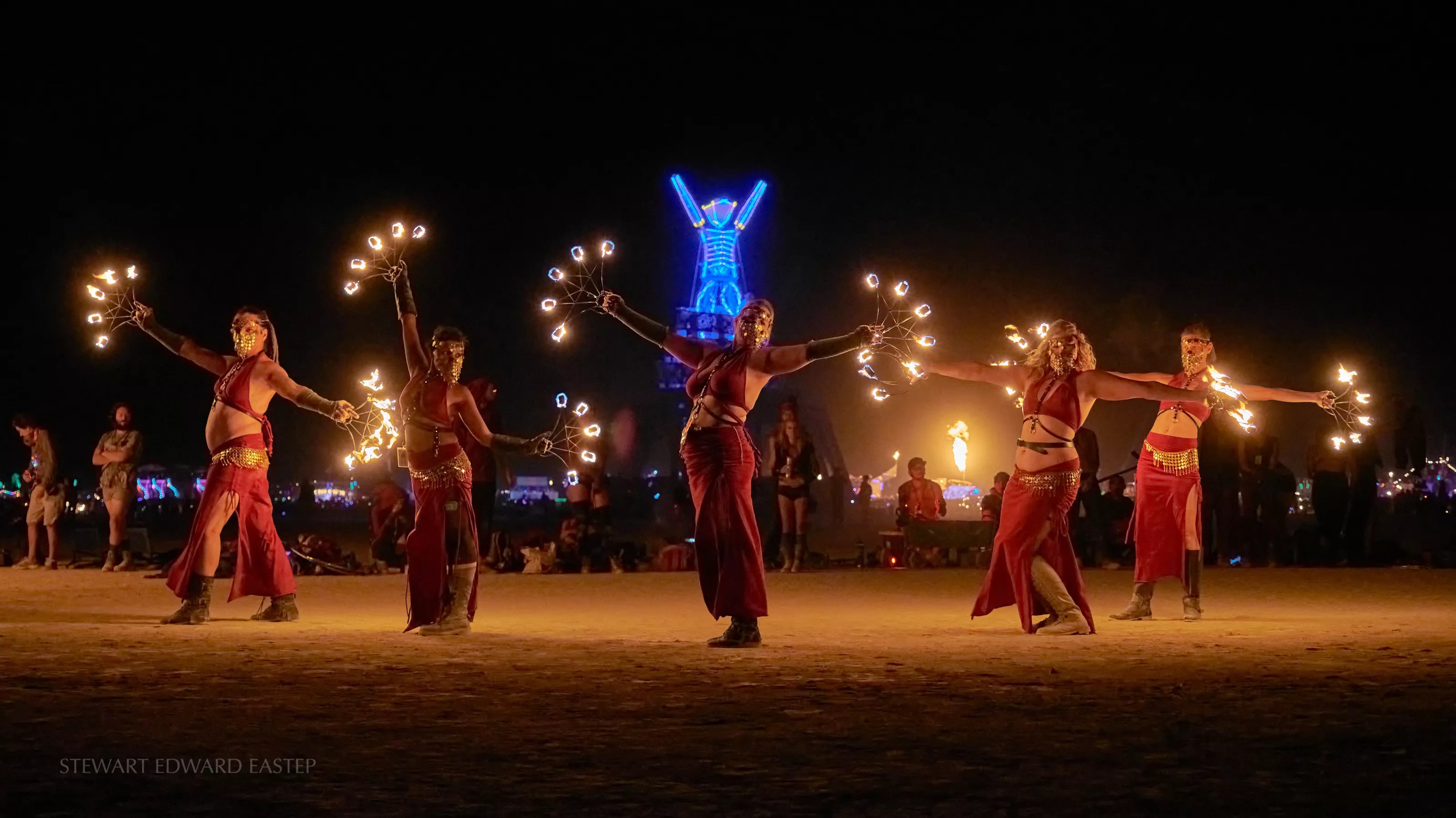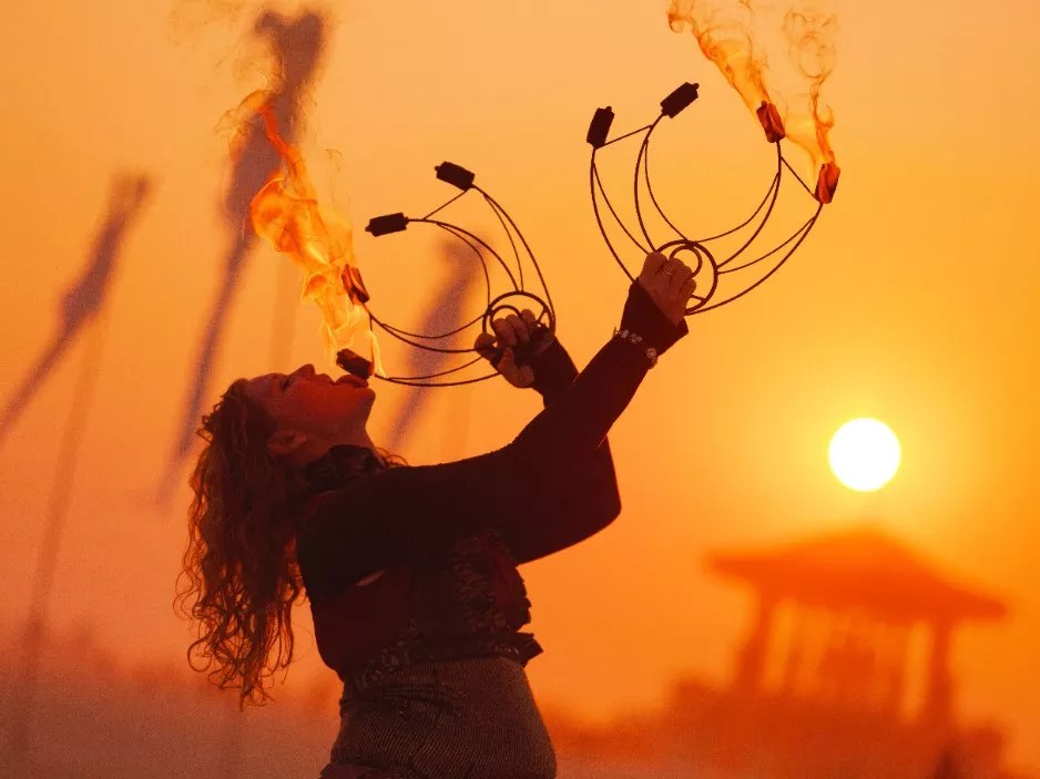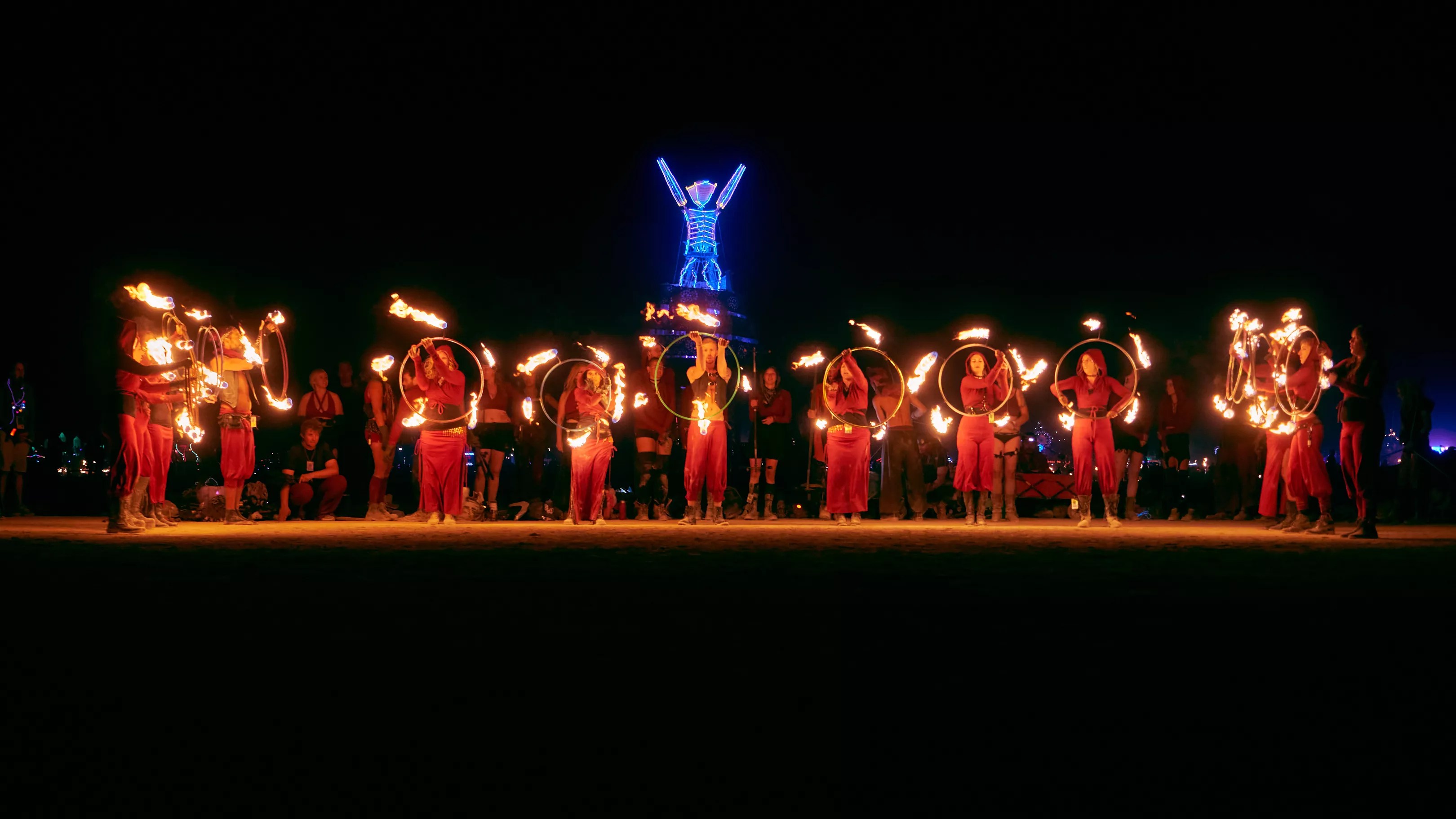 As flow artists expand their skill sets, they gravitate to communities and events that champion the art form, including Burning Man and its regional burns. Many flow artists are burners, who migrate from around the world to the Burning Man playa with near-religious dedication every year. Since its beginning in 1986, the “Big Burn” has become a mecca for flow artists — fire spinners, in particular — that allows ample space for free expression.