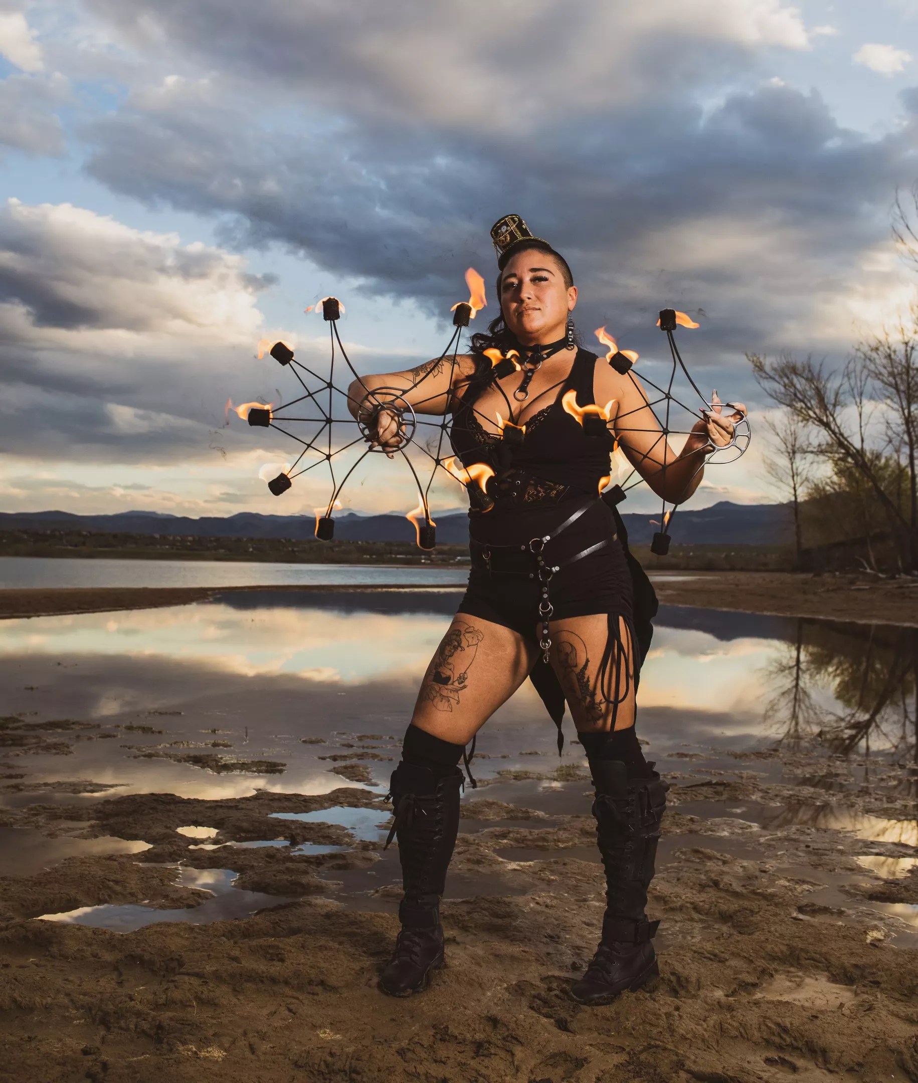Morris was introduced to spinning fire through friends when she lived in Dillon, and she continued to pursue it when she moved to Denver in 2010 for the “thriving music and art scene,” she says. “We have a really beautiful festival culture, and tons of events that support performance artists.”