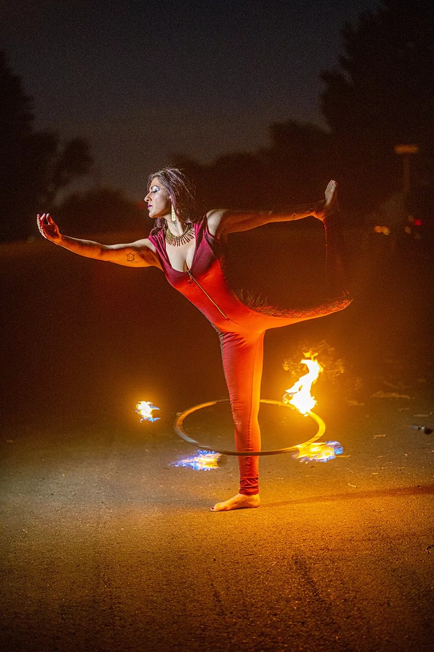 “We really came up with our name going through different definitions of things,” Kouremenos adds. “Candela means a unit of luminous intensity in science, and we were like, what a perfect thing to call ourselves! We each offer something unique to the collective. Tani is super-skilled at hoops and teaches us all of our hoops stuff; Andrea is really good at media and videography and photography and helps us with that; and then I bring in the aerial aspect and choreograph our aerial gigs and train the girls on that stuff. It was really nice to find this collective that you could consistently rely on for that practice.”