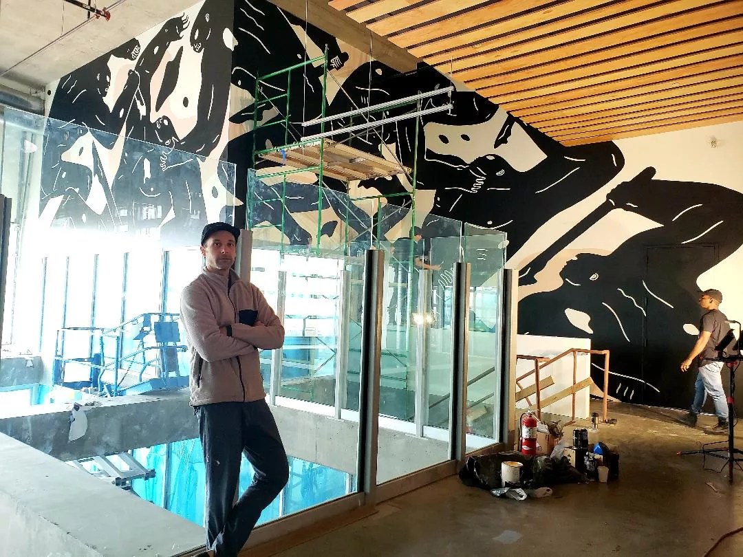 Cleon Peterson in front of his completed mural in the Source Hotel and Market Hall.