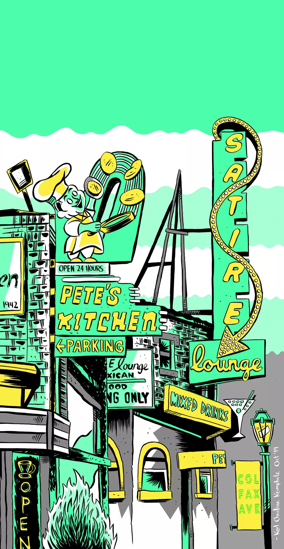 And eight doesn’t begin to capture everything Krumpholz loves about Colfax. “I still hit quite a few places like Tooey’s and Streets [of London] pretty regularly,” he says. “But if I had to pick just one, it would be the corner of East Colfax and Race. There is a lot of Colfax history right there, from the brilliant old signs and history at Pete’s Kitchen and Satire Lounge, as well as being a few steps from the Lion’s Lair, which to me simply represents Colfax Avenue. That’s probably why there are three of the eight banner illustrations that represent that corner of Colfax.”