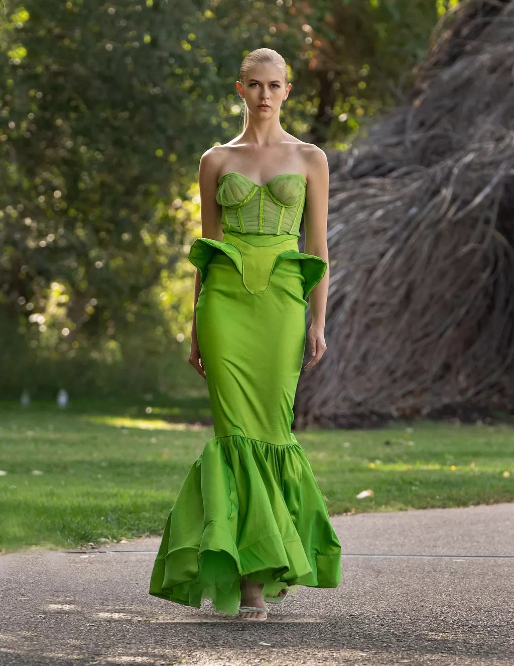 They also picked unusual settings for their debut fashion shows. The first was an evening at RedLine Contemporary Art Center, where the models became living art pieces, and the next was at the Botanic Gardens Chatfield Farms, where models slunk down a bucolic walkway with the dramatic Patrick Dougherty sculpture “One Fell Swoop” behind them.