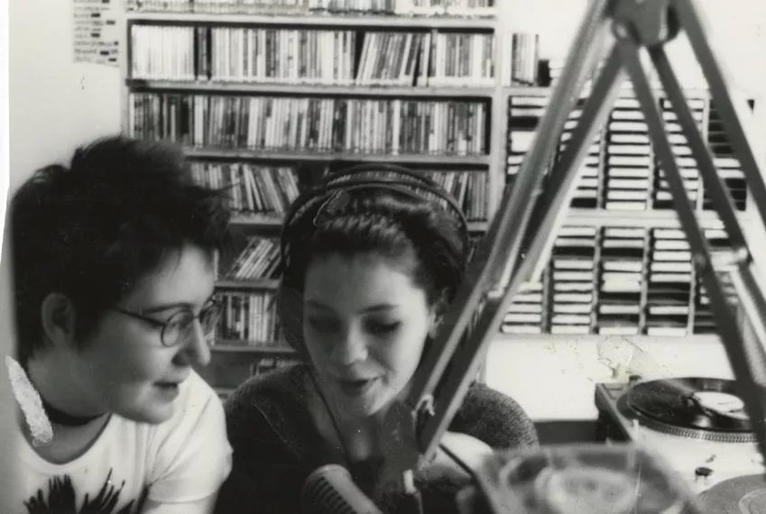 Best friends Strand (left) and de la Cruz (right) in 1998 during their Community Radio show on KDNK in Carbondale.